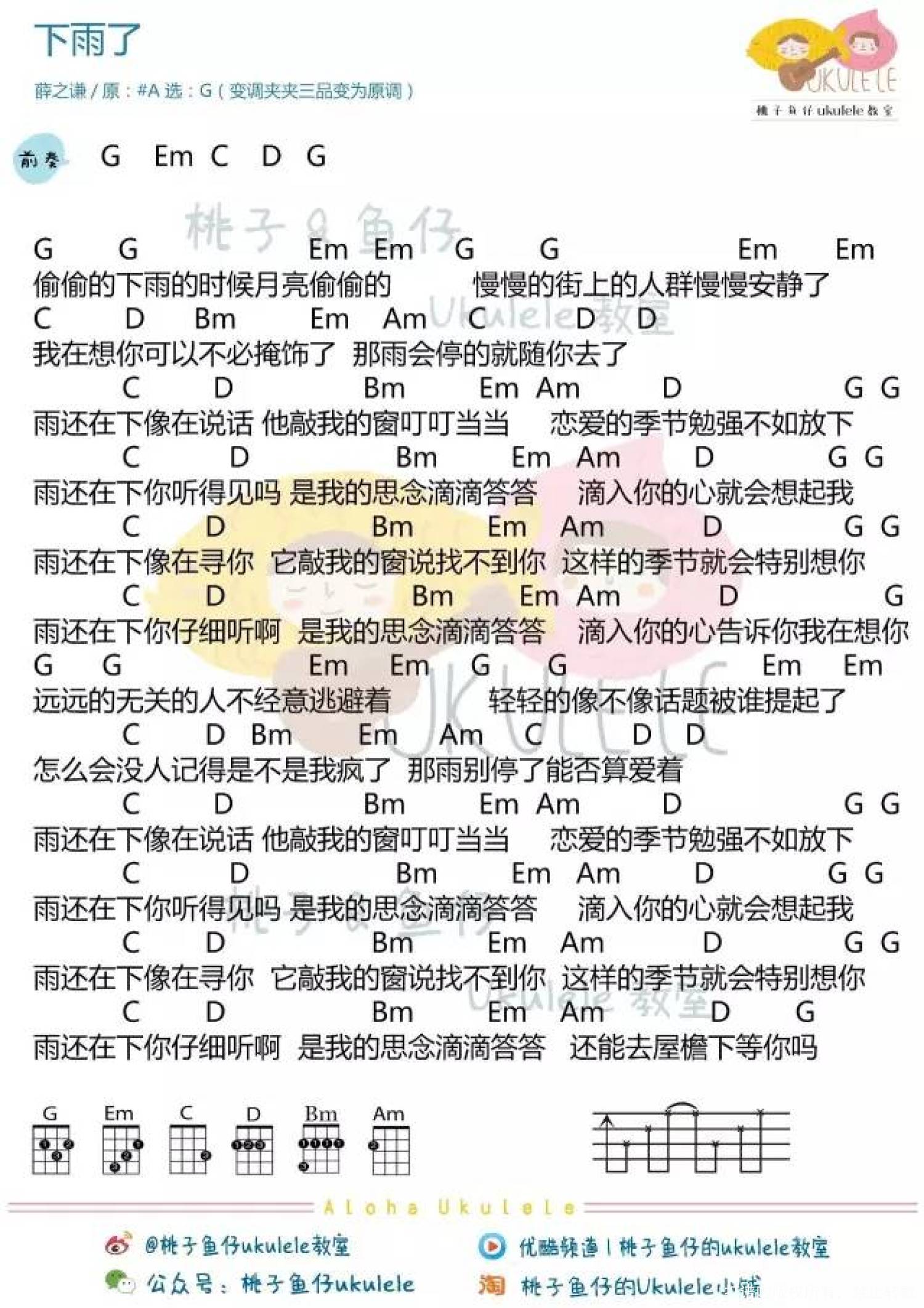 曲谱介绍: 继《绅士》、《演员》之后,薛之谦《下雨了》MV 正式发布,这场让薛之谦足足淋了72小时的大雨终于来到尾声,MV中暗色调的画面,在室内下起的倾盆大雨,一如下在每一个为爱情悲伤的人心中,配合忧伤的旋律和歌词,薛之谦演技爆发,一秒落泪,让歌迷看了十分心疼,感慨:“再逗比的段子手也有为爱情哭的一瞬间” 。 尤克里里曲谱