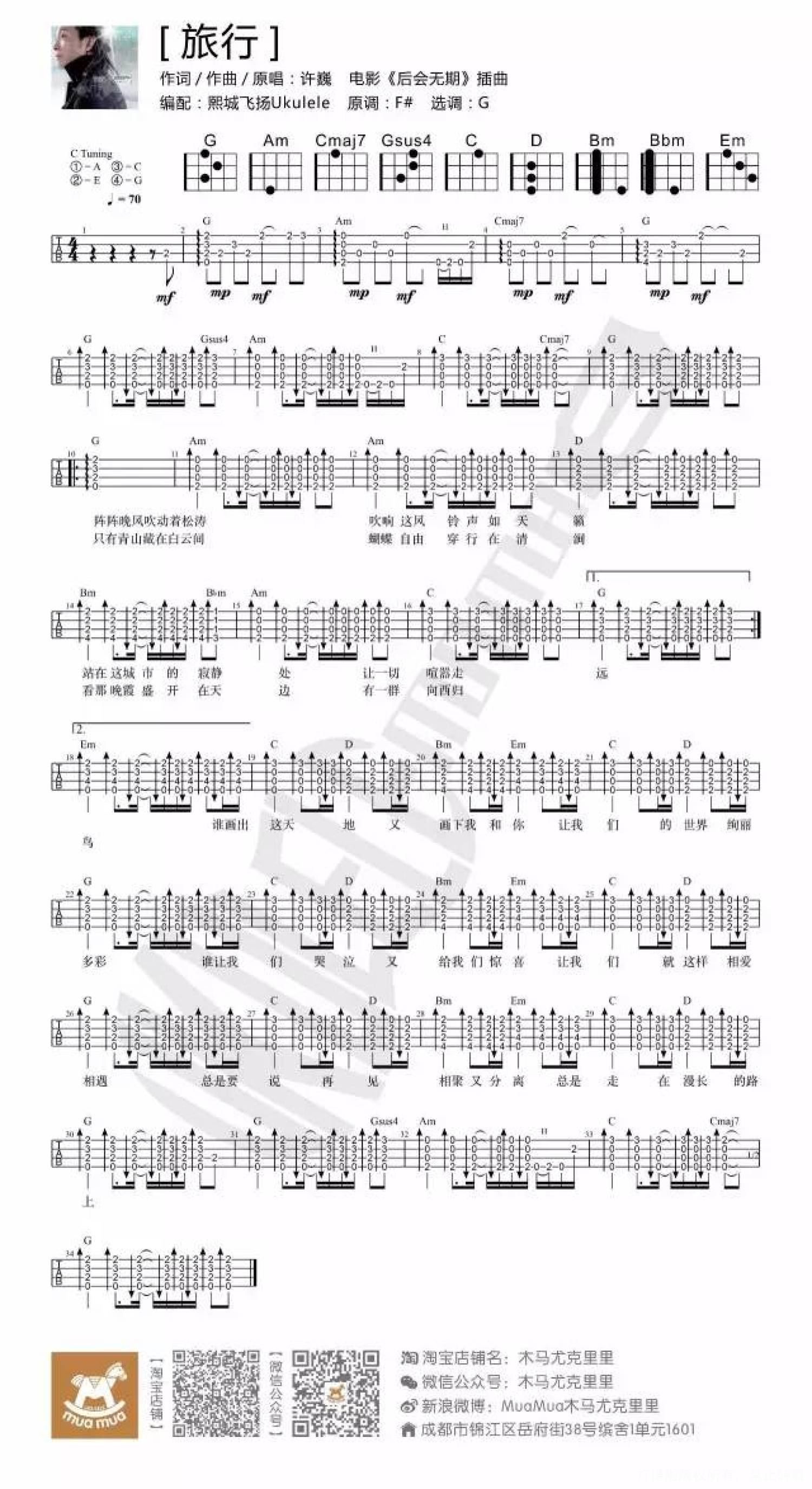 曲谱介绍: 许巍,是一位真正的音乐诗人,今天和你分享的歌曲是由许巍词曲创作,收录在其2004年发行的专辑《每一刻都是崭新的》中的《旅行》。2014年该曲成为电影《后会无期》的插曲之一。 这首歌是许巍为了纪念2004年初因车祸逝世的青岛朋友丁志强创作的,事实上这是一首很早就录音完成的歌,却是最后才有名字的。对于许巍来说,创作就是生活的一部分,一边感悟生活一边把经历和思考写成音乐;经过持续7个月的斟酌之后,“旅行”这个名字终于跃然纸上了。许巍说,旅行是经历种种景色的地理意义上的跋涉,人生更是这样一场需要经历风雨的“旅行”。 《旅行》是在词曲、编曲、意境各方面极为和谐的一首歌,它有着入世的深情况味,也有着出世的随缘自在。曲中那些简单的意象,松涛、风铃、蝴蝶、晚霞,犹如随手拈来的缤纷花朵,在副歌中自然流露的儿童的天真与长者的睿智中形成水乳交融般的完美和谐。人生是漫长的旅行,青山绿水美景如画都是我们旅程中的一站。许巍的声音虽然略带沙哑,但是丝毫没有影响歌曲中应有的那一份清新感,而歌曲中小女孩的那天真无邪的哼唱声更增添了一份独有的意境感。 这首歌原曲是F#调,木马在编配的时候选调G调,升了半个音,大家唱应该是没问题的,这次演示首次采用GTP软件模拟示范的方式,希望大家可以跟着视频学。 2015此时此刻演唱会现场版 GTP模拟演奏示范 尤克里里曲谱