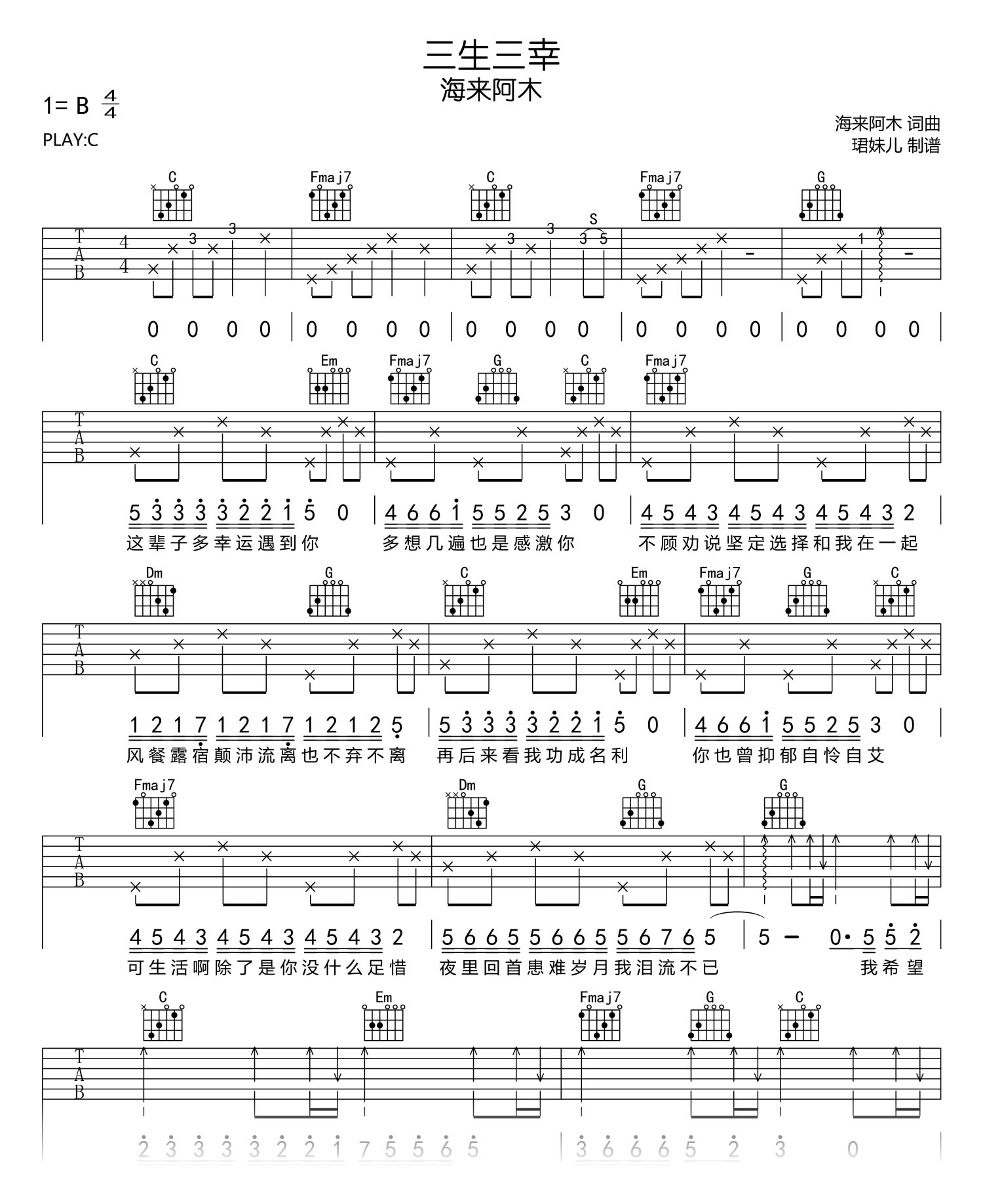 曲谱介绍: 海来阿木《三生三幸》吉他弹唱谱,采用C调指法编配,共有2张高清图谱,免翻页排版设计。