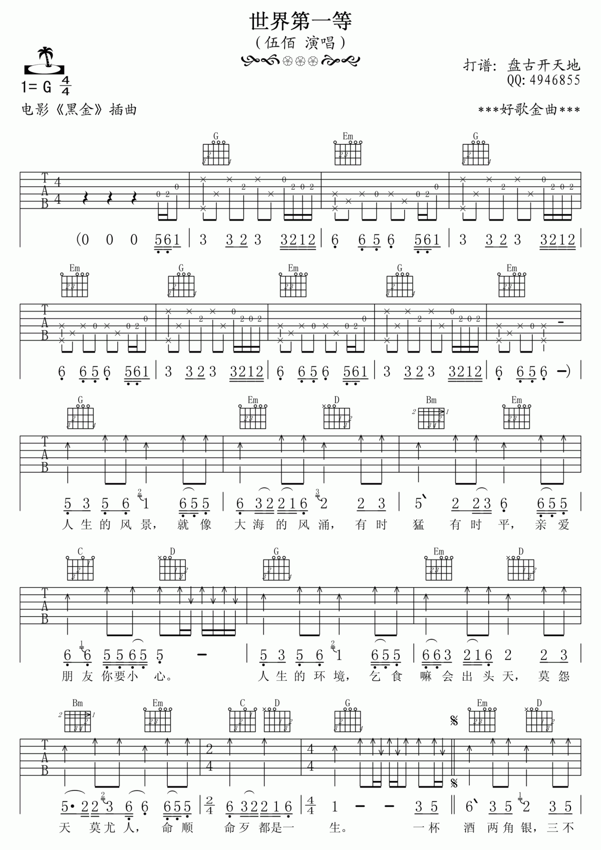 曲谱介绍: 伍佰《世界第一等高清》吉他弹唱谱,共有2张高清图谱,免翻页排版设计。