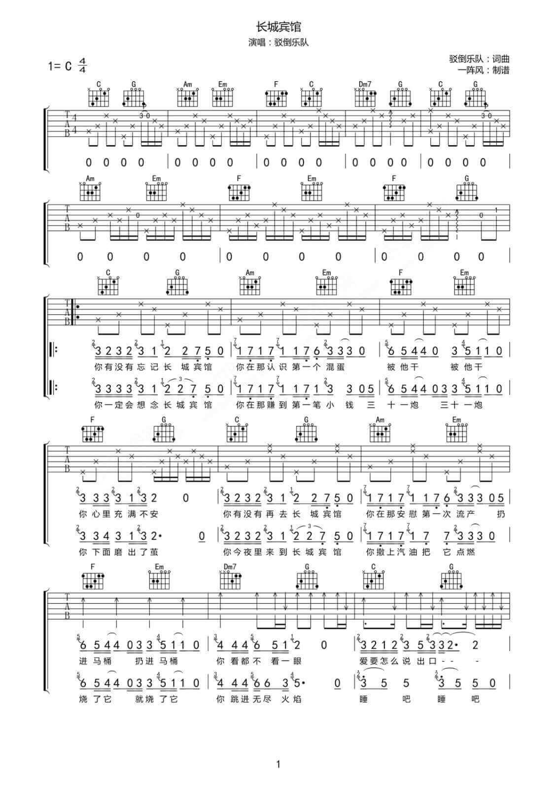 长城宾馆吉他谱 - 驳倒乐队 - C调吉他弹唱谱