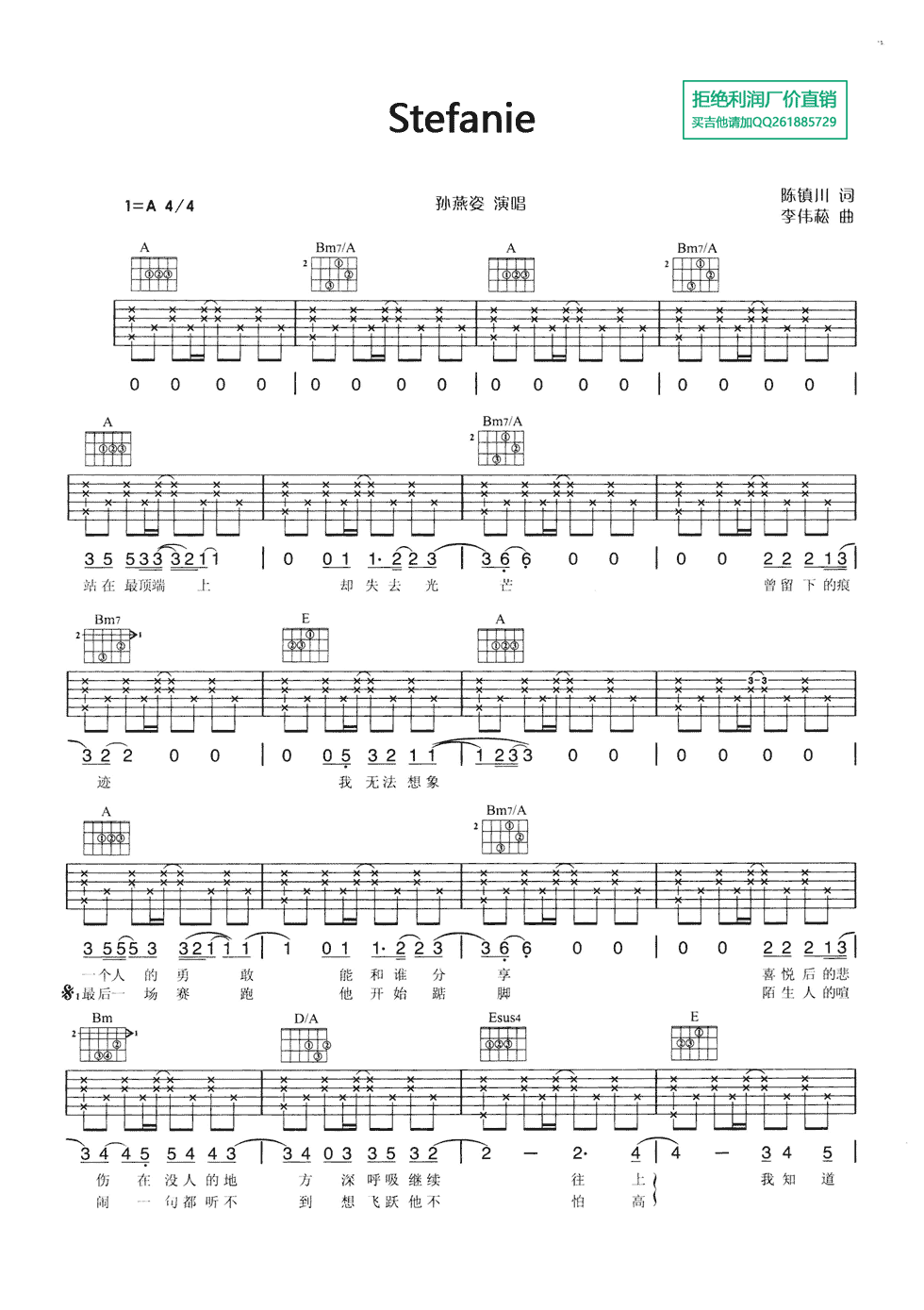 Stefanie吉他谱 - 孙燕姿 - a调吉他弹唱谱