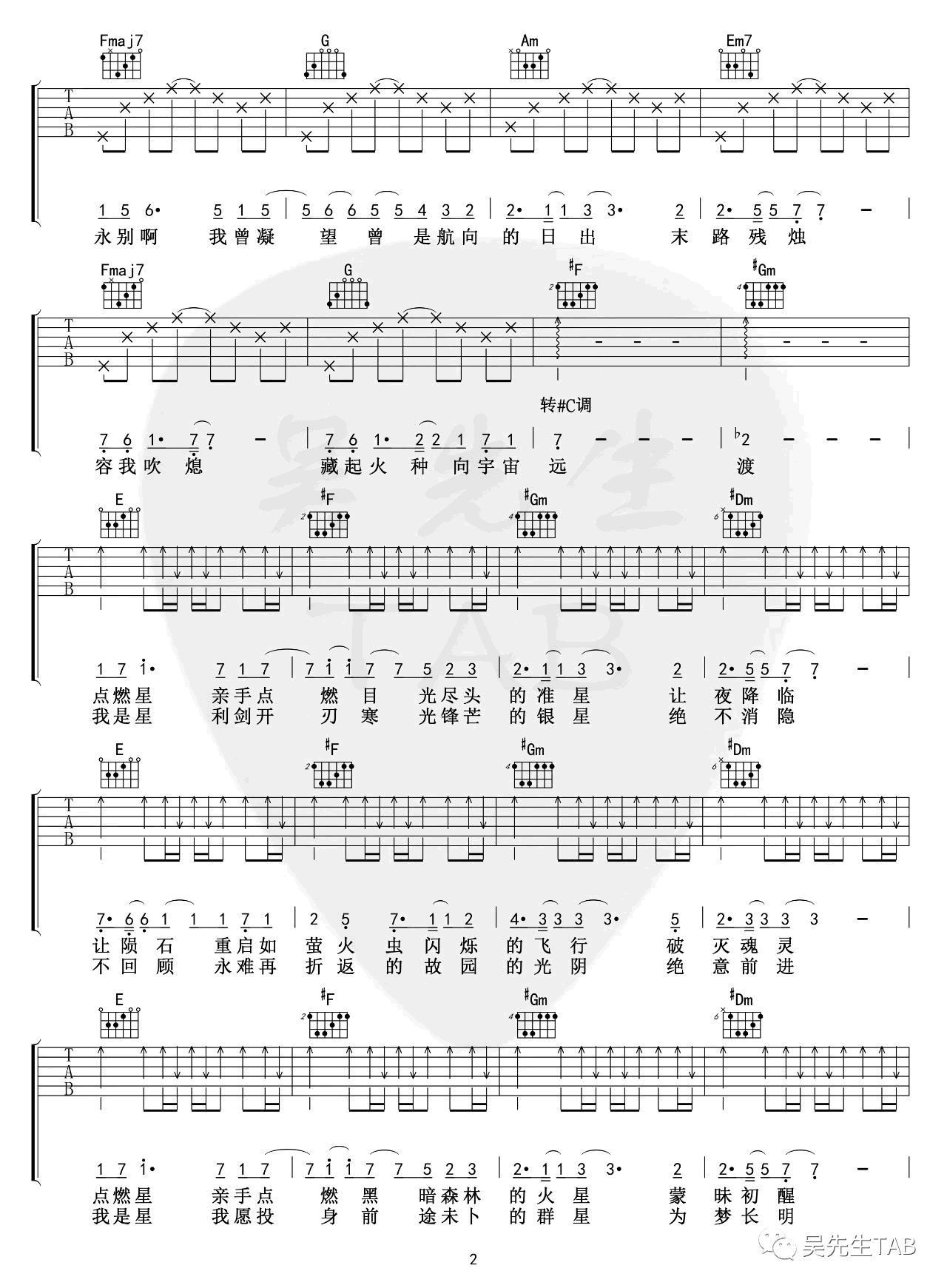 曲谱介绍: 夜航星吉他谱采用了D调指法,由吴先生编配完成。《我的三体》里,有很多个场景都戳到我的泪点了。黑暗战役主要想表达的就是适者生存理念,终极规律号低估了自己的对手最终落得舰毁人亡的下场,很多个场景在这首歌曲的带领下历历在目,这场由猜疑链引发的战斗最终筛选出来最合适帮助人类生存下去的人选,或许有很多人没有看到这部作品,无法感受到这首歌曲的意味,但是我们也能够在这段旋律中找到一点点味道。另外一首,和你吉他谱也很赞,小伙伴可以愉快的学习起来了。