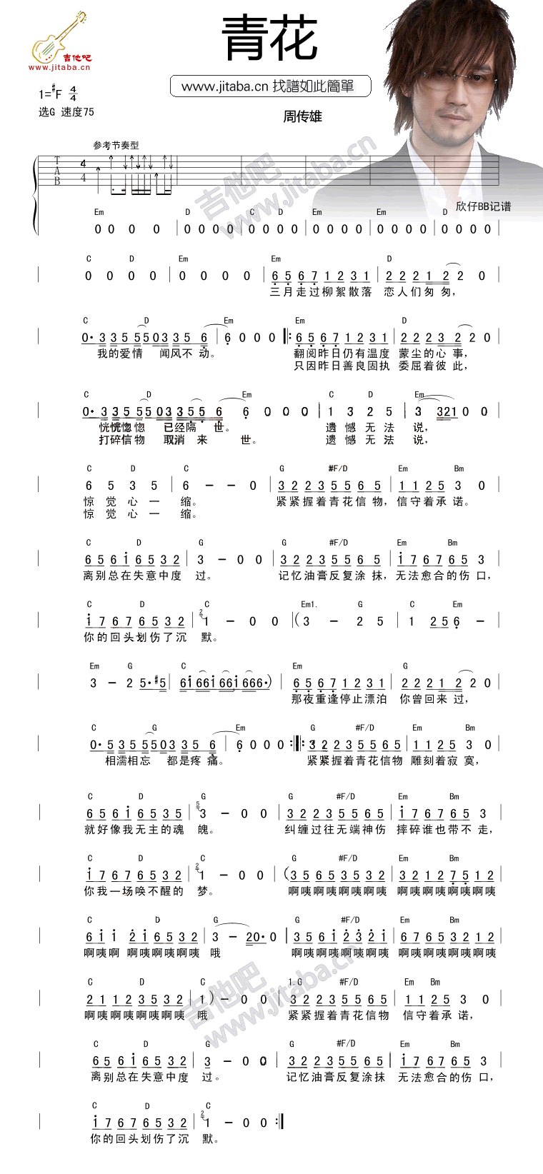 曲谱介绍: 青花吉他谱采用了F调指法,由琴谱网编配完成。这首《青花》是由陈信荣作词,周传雄作曲,编曲并演唱的一首歌曲,收录于周传雄由环球唱片发行的专辑《蓝色土耳其》中。周传雄认为青花瓷不但高雅漂亮,还能给人一种宁静镇定的感觉,好比爱情的承诺。在这首歌曲的旋律里融入了摇滚的气息,分离的落寞和痛苦立刻渲染出来,反而让人更感觉到信念的力量与坚持《青花》还隐喻了恋人为爱许下的承诺,如青花般永恒。另外,这首推开世界的门吉他谱也超级好听,小伙伴们有福啦,还不去练起来?