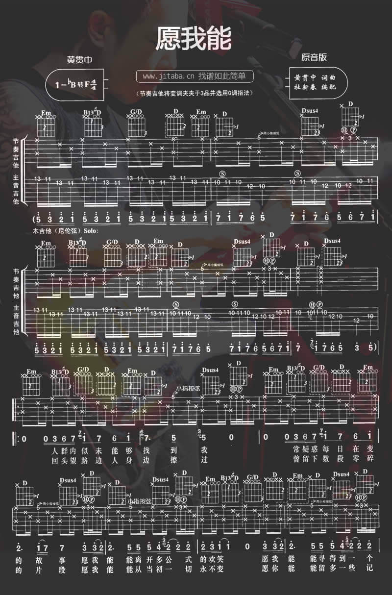 愿我能吉他谱 - 黄贯中 - B调吉他弹唱谱