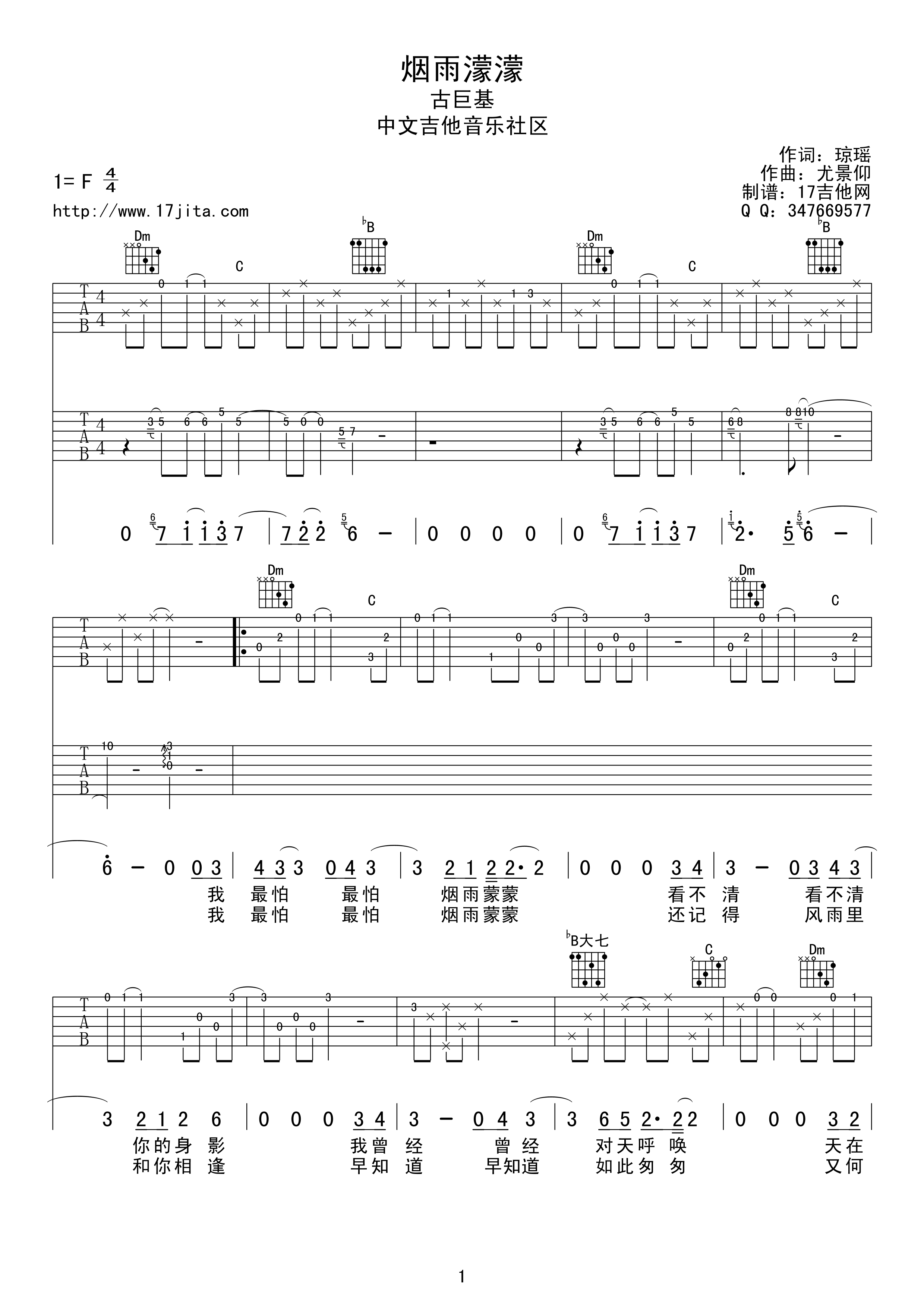 曲谱介绍: 烟雨蒙蒙吉他谱采用了F调指法,由17吉他编配完成。《烟雨蒙蒙》这首歌曲是电视剧《情深深雨蒙蒙》中的插曲,赵薇也演唱过这首歌曲,古巨基的演唱又是不一样的味道,两位主演分别都演唱出了自己的风格,这首歌听起来非常让人心痛,歌词对情感描写的非常细腻,烟雨一重重山水一重重,你的叮咛你的泪是我心中最痛,把故事里那种刻骨铭心和痛苦万分的爱表现的十分深刻,每一次听到这首歌曲都让我们想起了故事里那些令人深刻的故事情节。另外,和这首一样赞的霸王别姬吉他谱也非常NICE,大家快去学习吧!