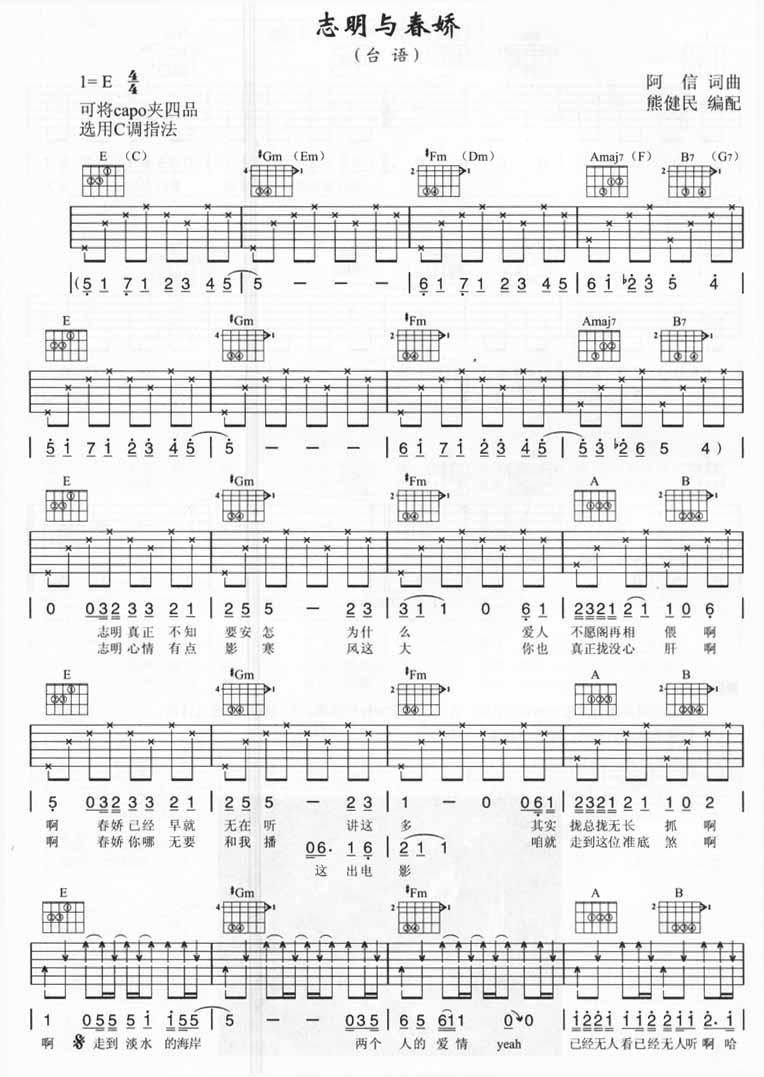 曲谱介绍: 五月天《志明与春娇》吉他弹唱谱,共有2张高清图谱,免翻页排版设计。