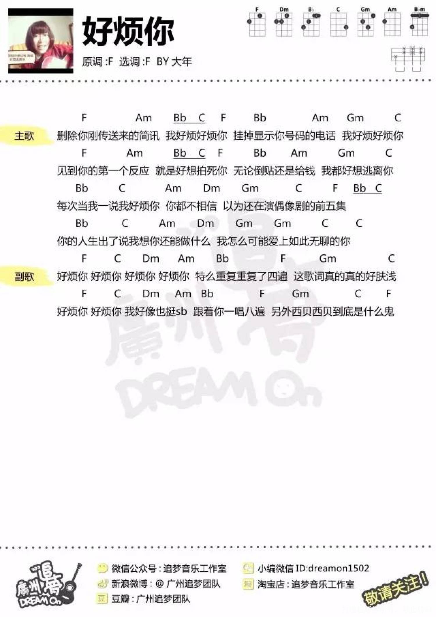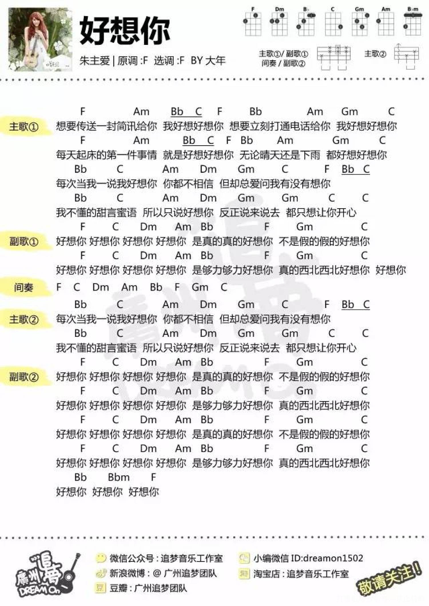 曲谱介绍: 《好想你》是朱主爱演唱的歌曲,由黄明志填词并谱曲,由李乃刚编曲。作为主打歌收录在《四叶草 Joyce Chu》EP中,于2015年11月13日发行。   尤克里里曲谱 好想你 | F调 好烦你 | F调