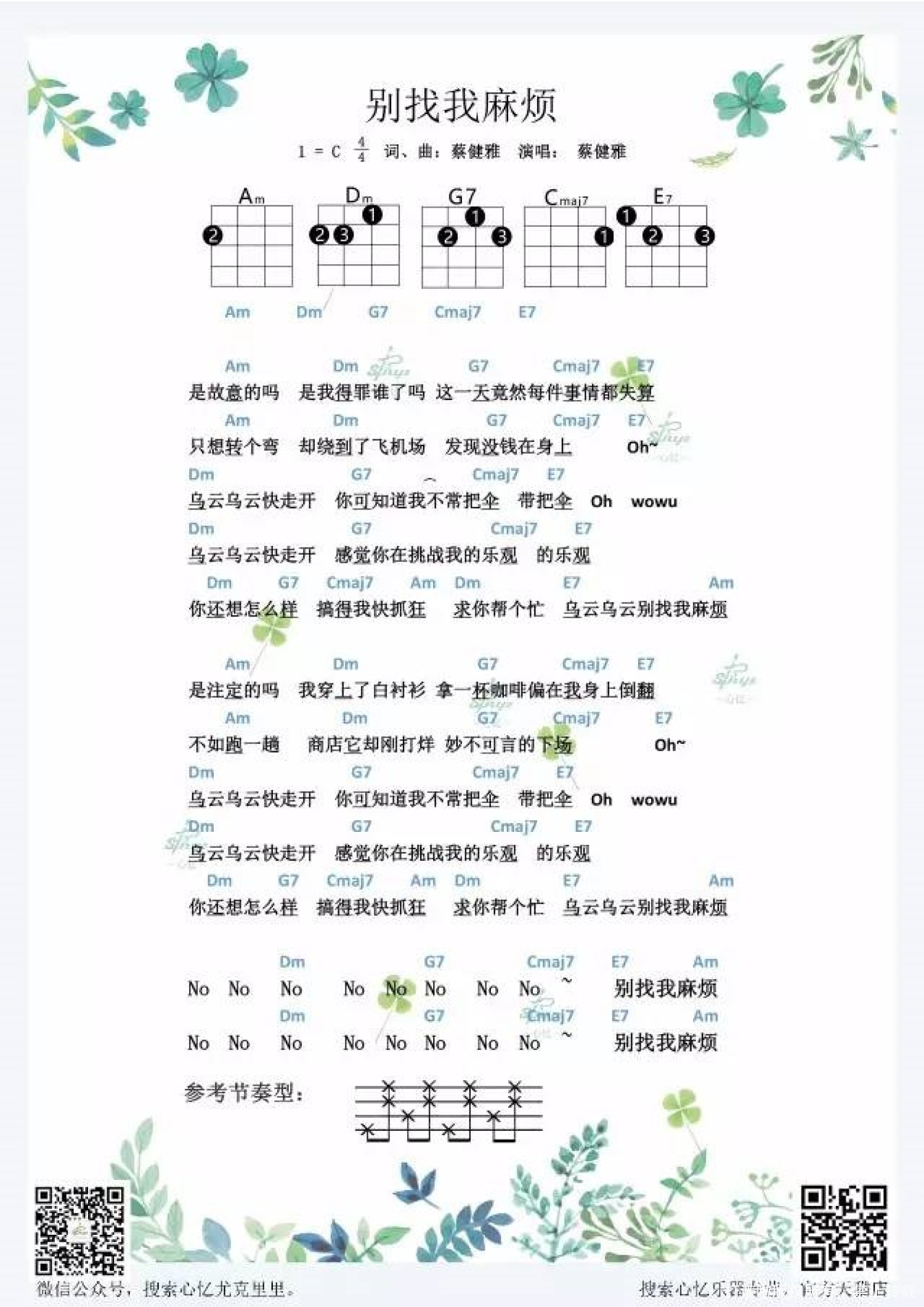 曲谱介绍: 这首歌的灵感是来自于蔡健雅的亲身经历,每次蔡健雅去户外演出,反正她去到哪里,当地就会下大雨,她去到任何户外演出,音乐节,每一次都会下雨,从来没有让她失望过。后来大家就开始叫她“雨神”。另外,她常常进一个房间,一些电器就会突然发生灵异事件,坏掉,或是突然发出声音,所以她觉得自己还挺好笑的,感觉一片乌云一直在头上,很喜欢跟着她,又知道她不常带伞(所谓的“带伞”是指她真的没有防备心)所以后来她就从幽默的角度,而不是从埋怨的角度写了这首歌曲。尤克里里弹唱谱