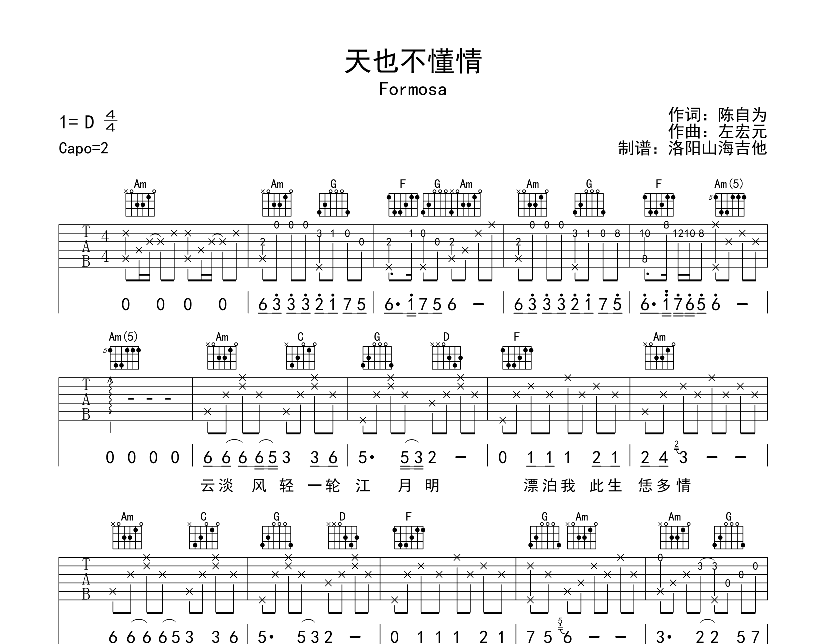 曲谱介绍: Formosa《天也不懂情》吉他谱,由洛阳山海吉他制谱,选用C调指法,原调D调,节奏4/4拍,弹唱难度初级简单,本谱含完整前奏按原版编配,总共2张高清六线谱图例。