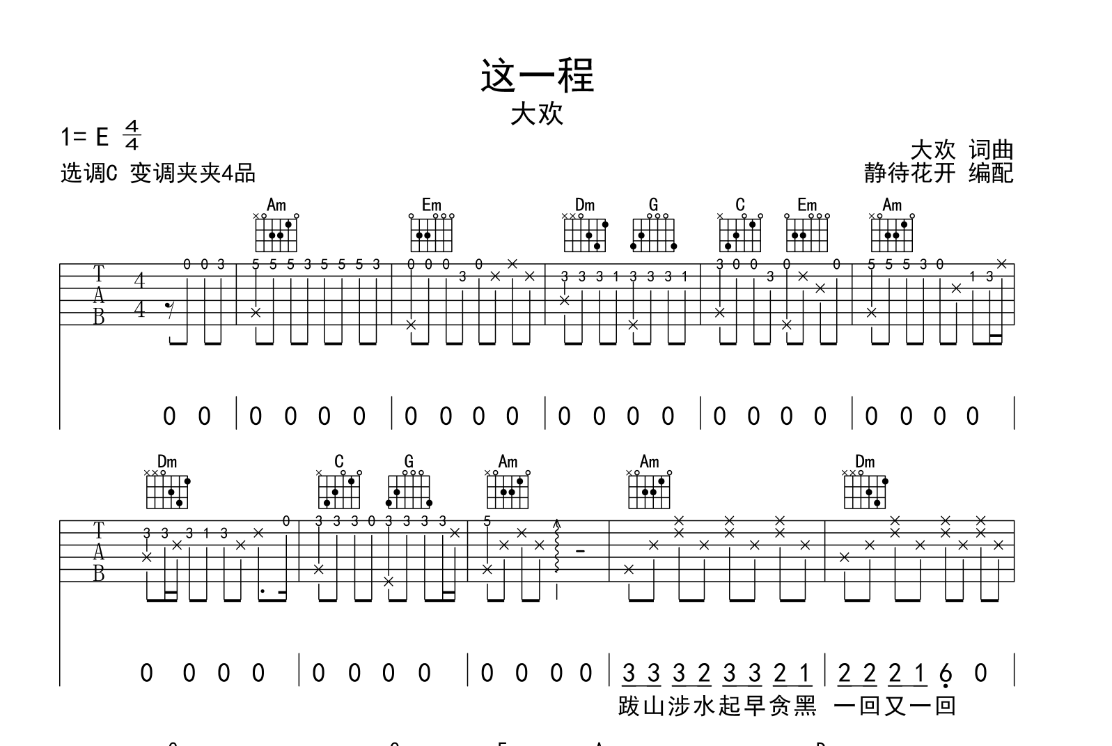 曲谱介绍: 这一程吉他谱,大欢演唱,本谱采用C调和弦指法编配,节奏4/4拍,曲速80拍每分钟,弹唱建议变调夹夹4品,指法简单,共三张六线谱,本谱由@静待花开制谱上传。