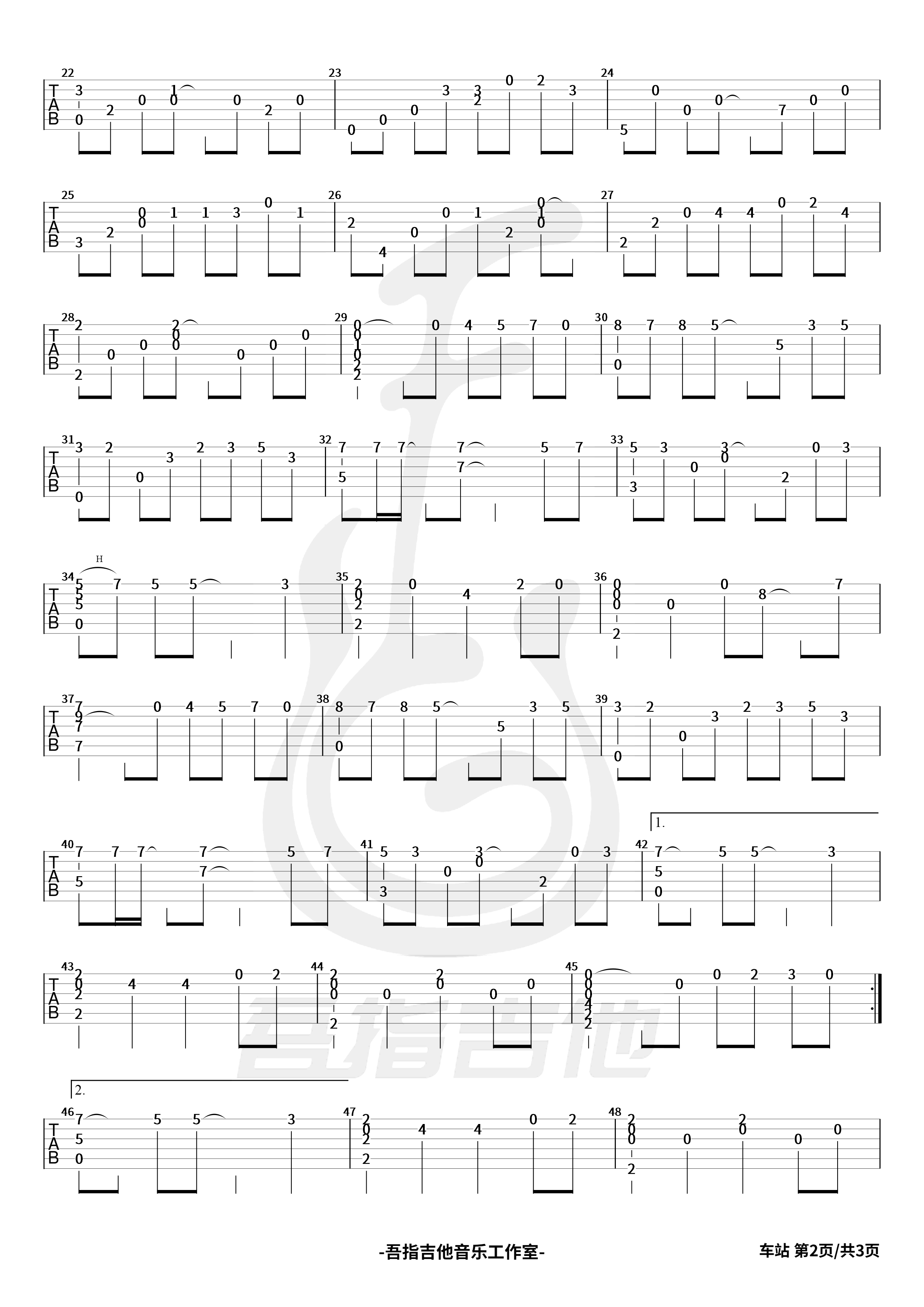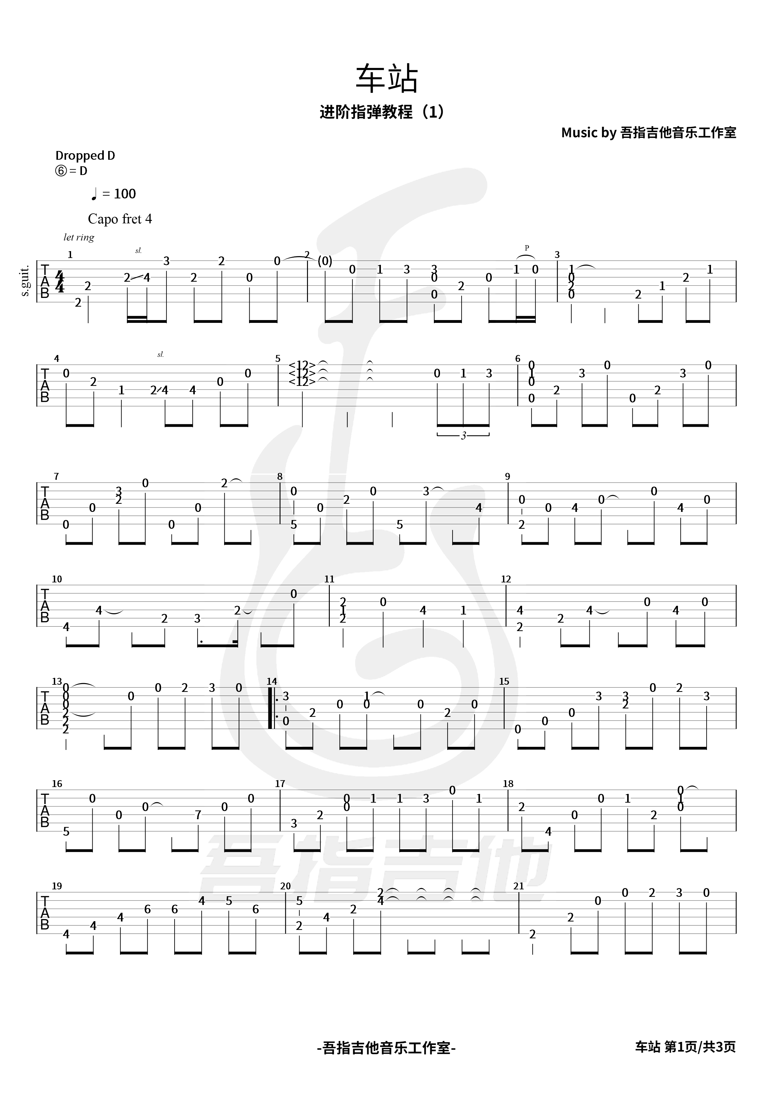 曲谱介绍: 车站吉他指弹谱,本期改编为大家带来车站,原曲是竹内玛莉亚为中森明菜创作的歌曲,本次改编选自李健的版本,属于进阶指弹难度。这首曲子需要把六弦调成D,Capo夹四品。前奏部分琴友们可以弹奏的随意一些,不用完全跟随节拍器。 《车站》吉他指弹演示/教学视频,独奏曲谱共三张图片。前奏讲解教学可以登录观看。