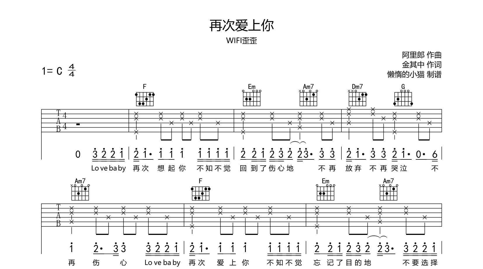 再次爱上你吉他谱 - WIFI歪歪 - C调吉他弹唱谱