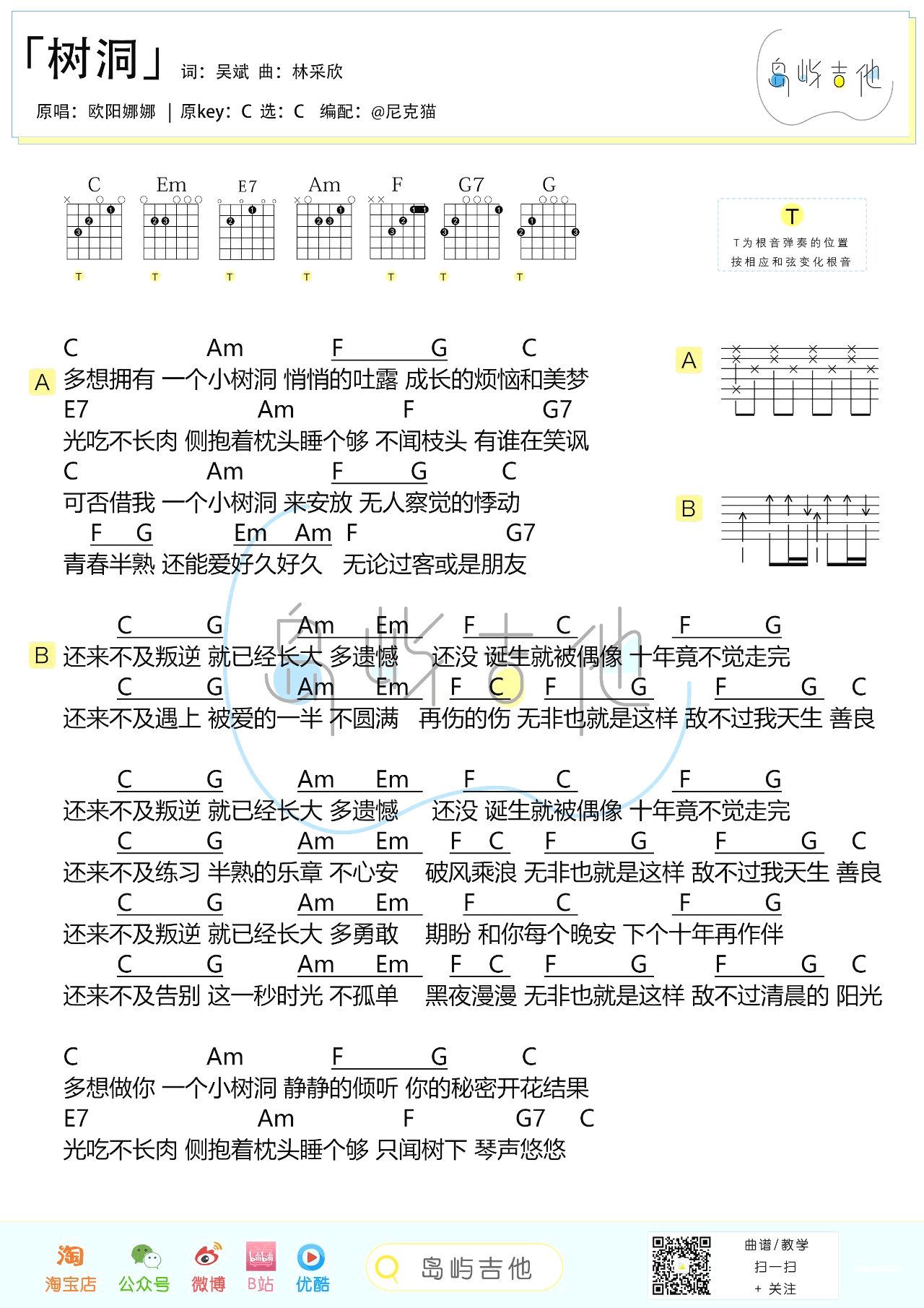 曲谱介绍: 树洞吉他谱采用了C调指法,由岛屿吉他编配完成。这首歌曲由欧阳娜娜演唱,她的嗓音有着最纯粹最干净的模样,唱出了青春期女孩心底的那些秘密,这首歌曲受到了很多人的喜欢,被欧阳娜娜动人的声音所吸引,让我们更加期待她更多的音乐作品。听兄弟说,在云端吉他谱听了耳朵会怀孕,快快学起来,学完去撩妹! 吉他弹唱演示及视频教学 吉他弹唱演示及视频教学