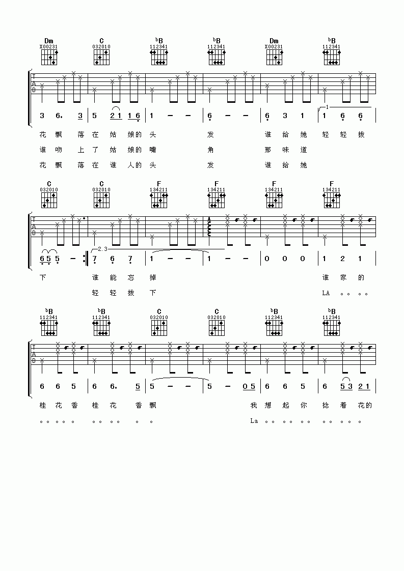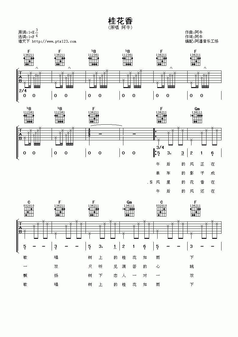 曲谱介绍: 阿牛《桂花香》吉他弹唱谱,共有4张高清图谱。