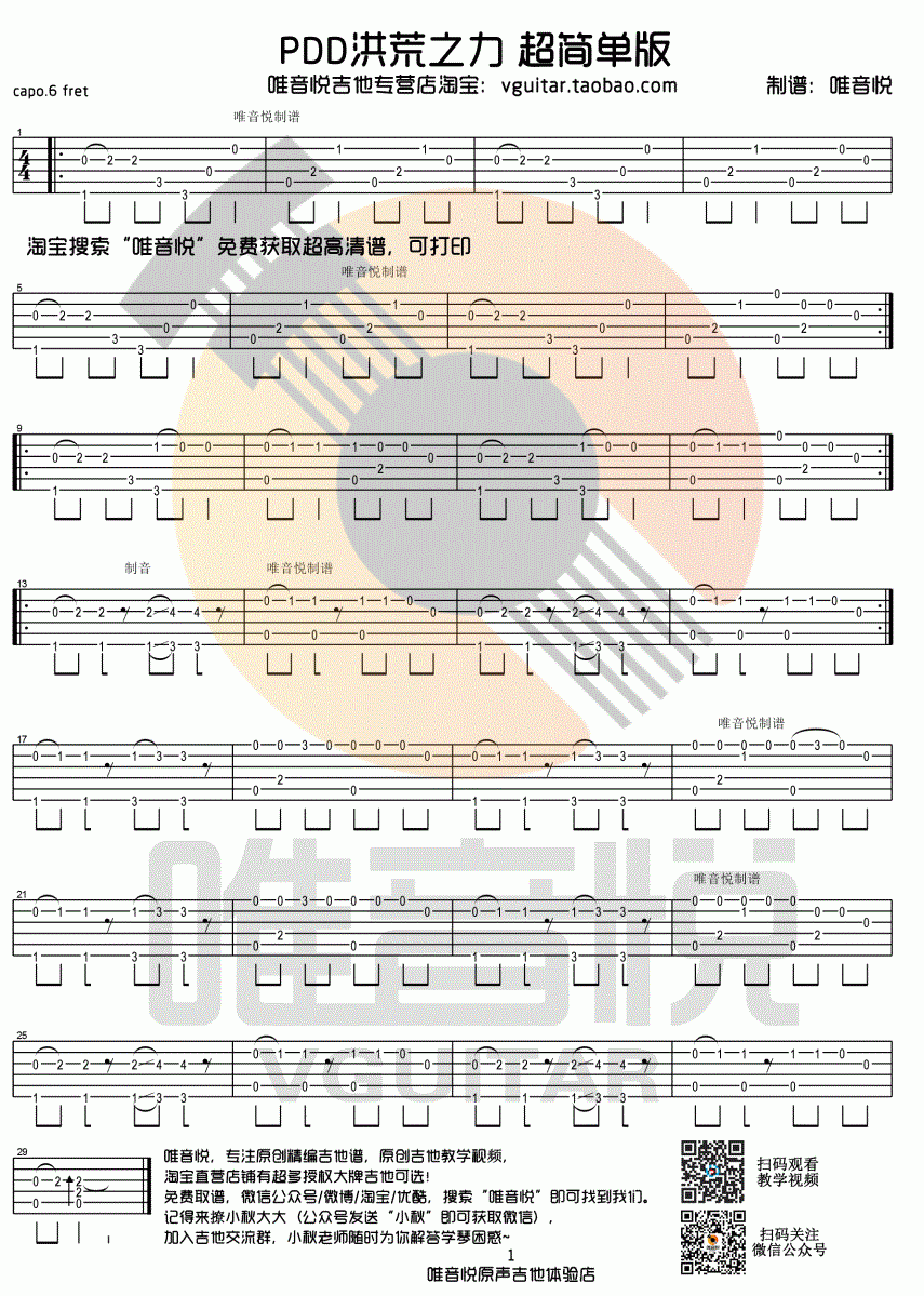 曲谱介绍: PDD洪荒之力《PDD洪荒之力_简单版版》吉他独奏谱,共有1张高清图谱,免翻页排版设计。