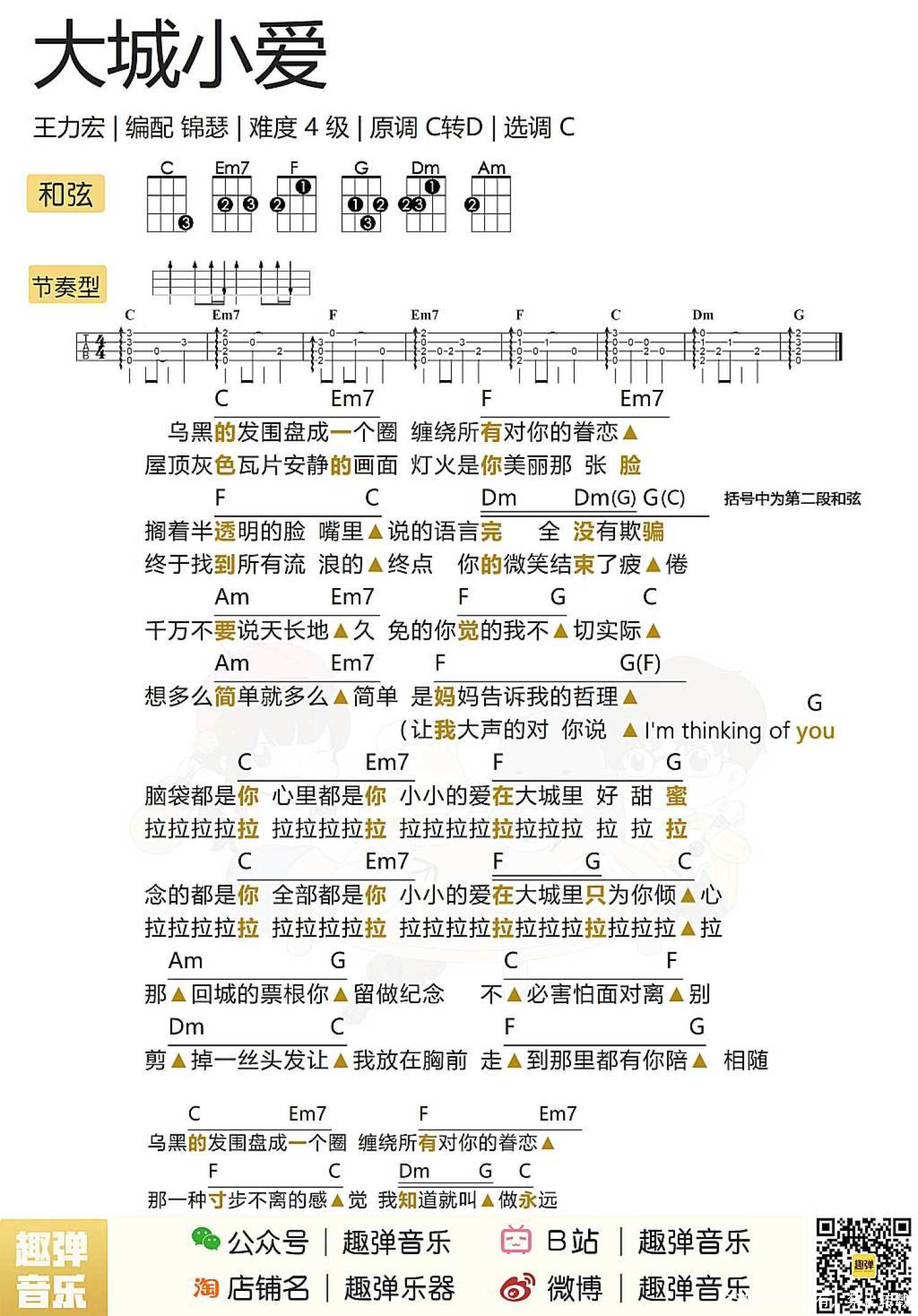 曲谱介绍: 王力宏《大城小爱》_C调尤克里里谱