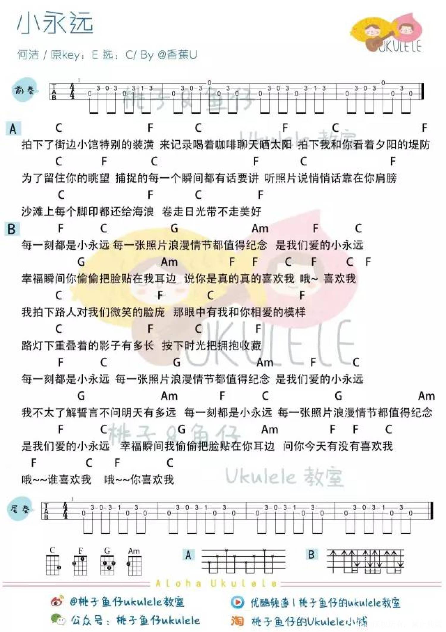 曲谱介绍: 甜美的歌声,滋润枯燥的内心她的一首“甜得化不开”的浪漫情歌,鲜活的流淌在我们的生命中,记忆里……每一刻都是小永远,每一张照片浪漫情节都值得纪念是我们爱的小永远每一刻都是小永远是我们爱的小永远小永远何洁关于歌曲《小永远》 《小永远》是中国内地流行音乐女歌手何洁演唱的一首情歌,由李峰填词,郑楠作曲,KennC编曲并制作,收录在何洁2011年10月发行的专辑《短暂的爱情》中。这首歌曲依然是在“减法企划”概念下推出的第,由担任孙燕姿御用编曲人的新加坡音乐人KennC担任编曲,秉承了“减法”的原则,只保留最基础的旋律与配器。李峰包揽了何洁全部音乐的歌词创作,将那份热恋中小女生的甜蜜幸福用《小永远》呈现出来,作曲人郑融则用音符拼贴出一幅亲昵的画面。歌曲描写了恋人之间爱意悠悠的甜蜜经历,两情相悦的浓浓情意表露无疑,是一首非常适合热恋中的情侣在KTV中点唱的浪漫情歌。整支歌曲听上去简单流畅,是一首“甜得化不开”的浪漫情歌,不经意间便打动了心中最柔软的部分。歌曲MV视频教学曲谱