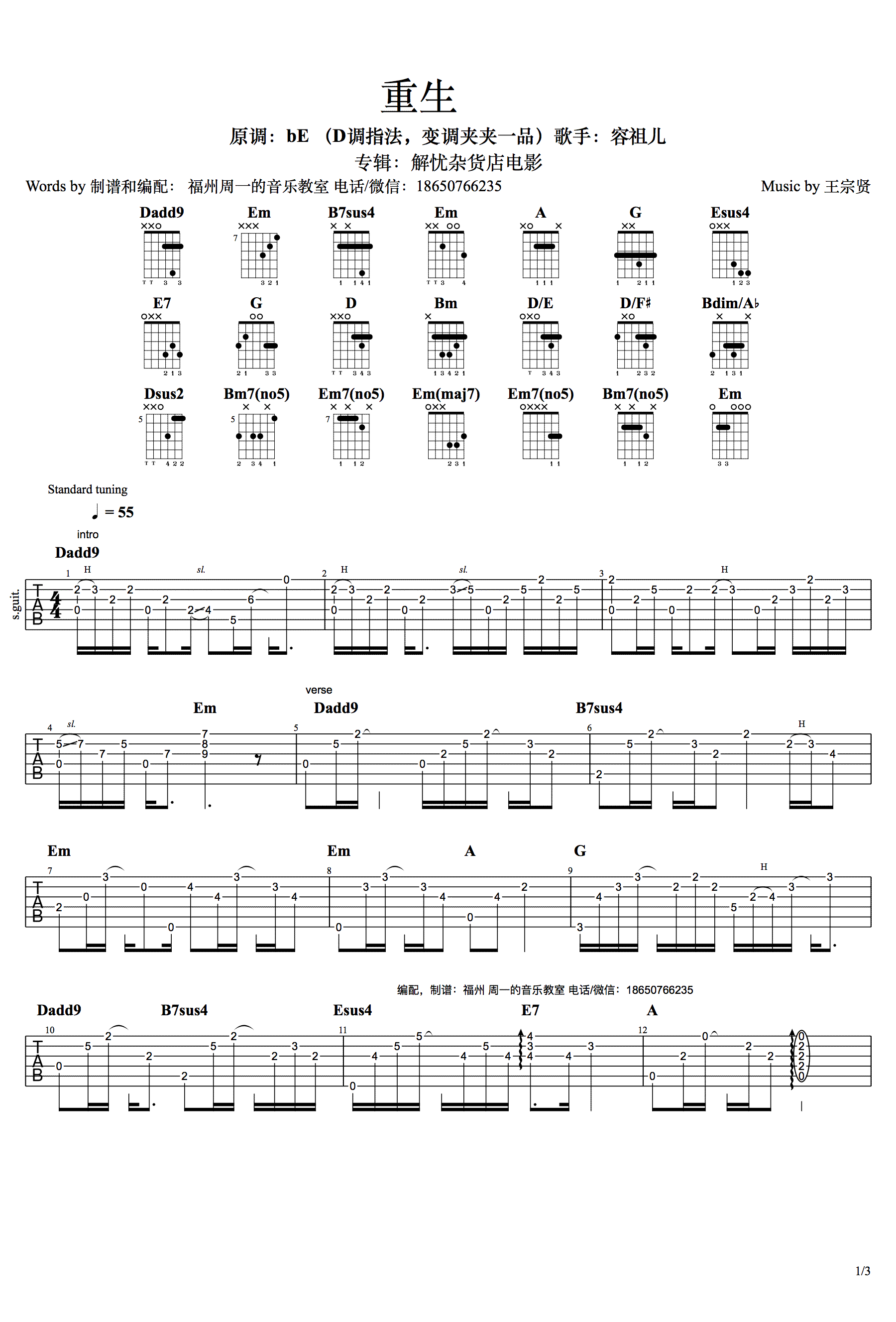 曲谱介绍: 重生吉他谱采用了D调指法,容祖儿的嗓音犹如天籁,俘获了每一位听众的心。《重生》这首歌曲是由韩寒作词,容祖儿演唱的,是电影《解忧杂货店》主题曲。在容祖儿低吟柔美的声音中,我们仿佛做了一场美梦,如果可以让你选择人生重来或继续,我们会做出怎样的选择?或许我们没有办法之间说出答案,这首歌曲有种倾诉的感觉,有所经历,这首歌曲给我们带来了力量,带来了温暖,让未来的我们不在迷茫。号外:在这里小编要推荐这首乘客吉他谱,它也很好听,大家赶快学习起来啦,不要犹豫!