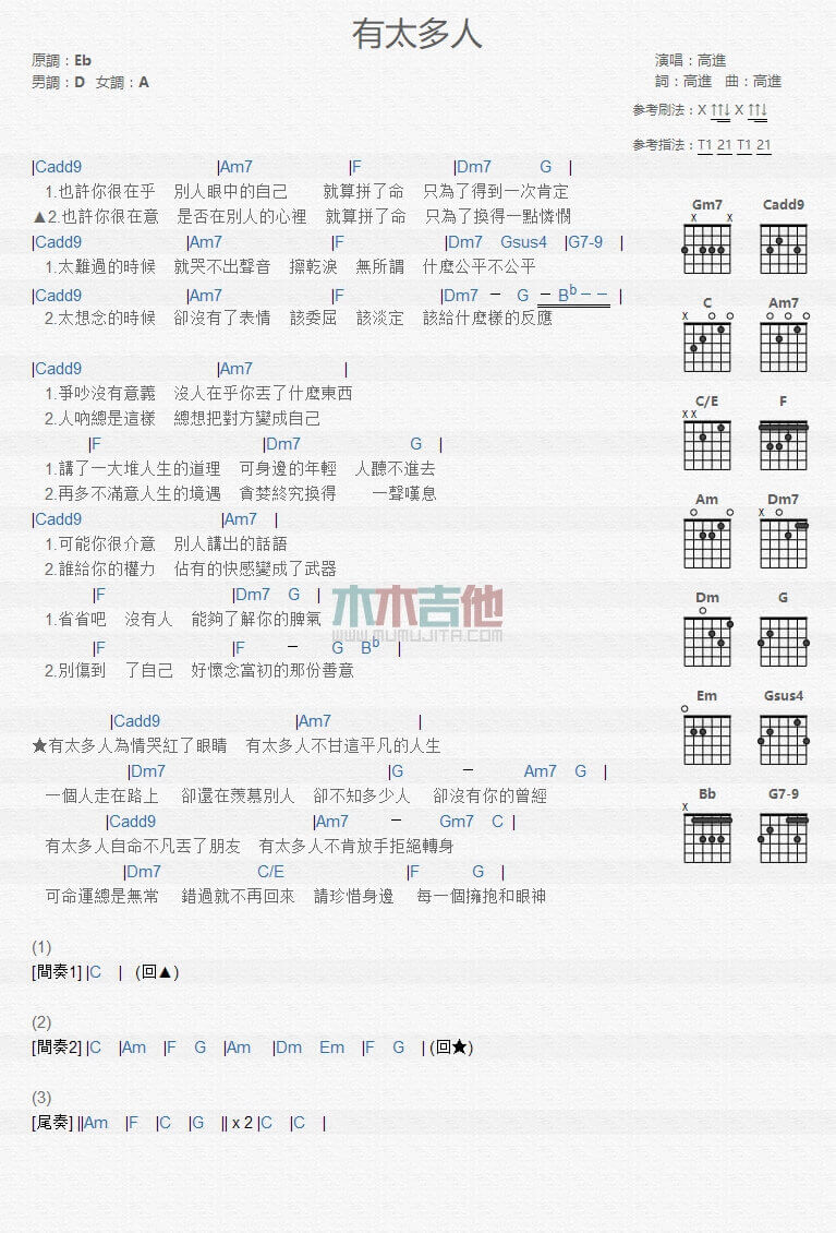 有太多人吉他谱 - 高进 - D调吉他弹唱谱