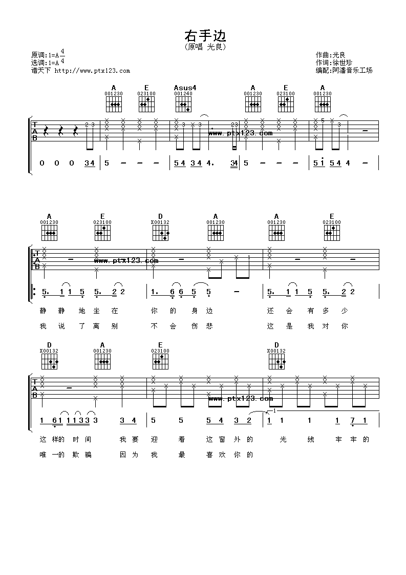右手边吉他谱 - 光良 - A调吉他弹唱谱