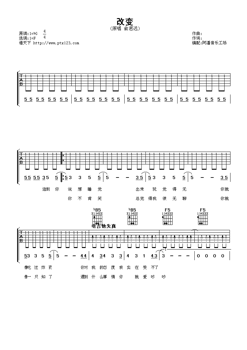 曲谱介绍: 改变吉他谱采用了F调指法,由阿潘音乐工场编配完成。另外,和这首一样赞的你吉他谱也非常NICE,大家快去学习吧!