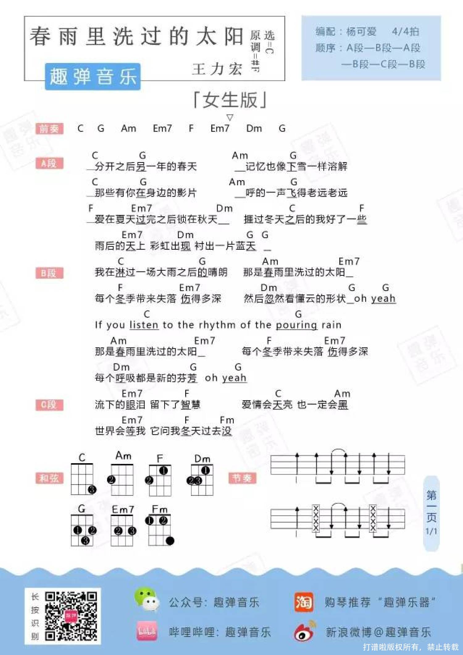 春雨里洗过的太阳尤克里里谱 - 王力宏