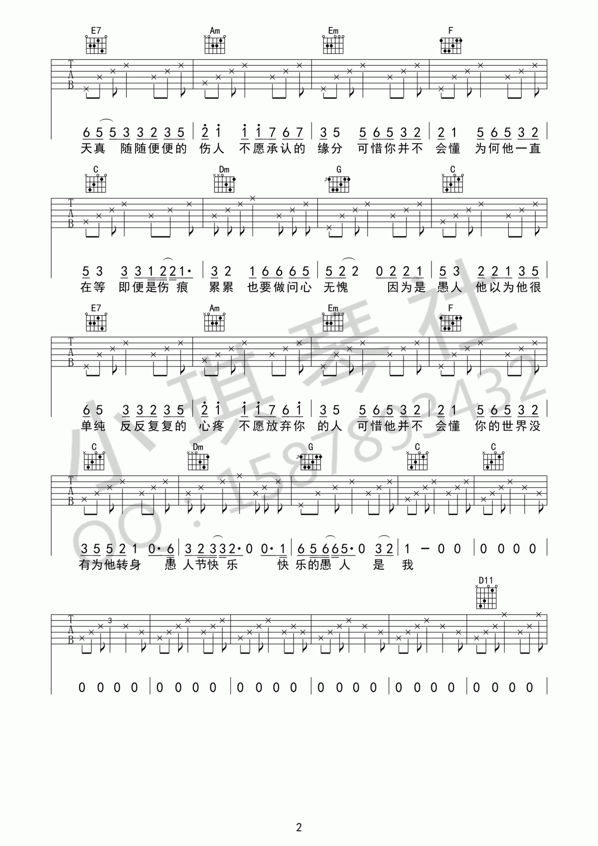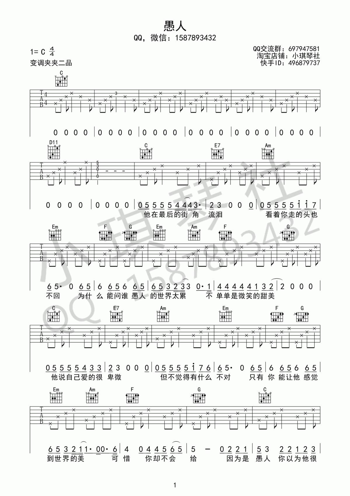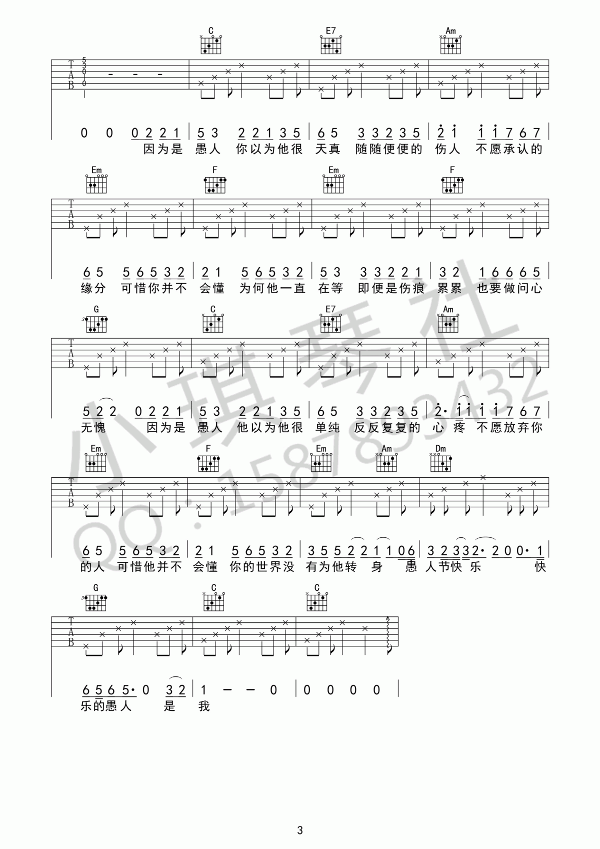 曲谱介绍: 赵烁《愚人》吉他弹唱谱,采用C调指法编配,共有3张高清图谱。