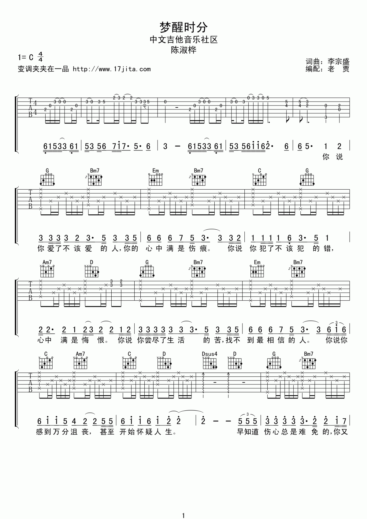 曲谱介绍: 陈淑桦《梦醒时分》吉他弹唱谱,采用C调指法编配,共有2张高清图谱,免翻页排版设计。