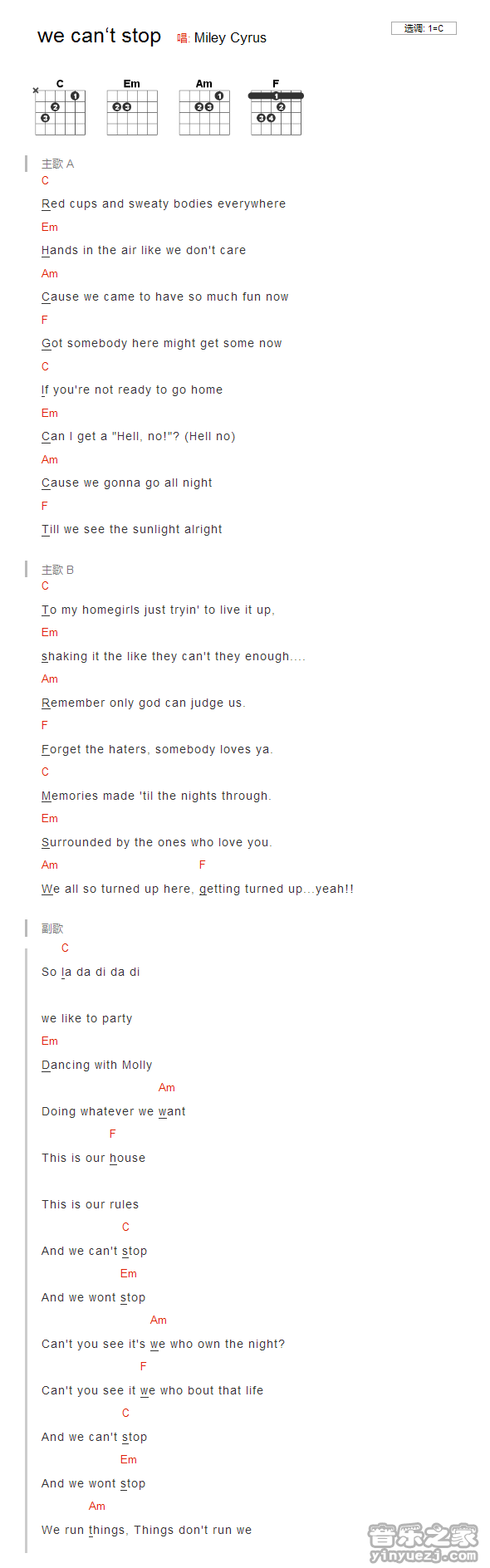 we can't stop吉他谱 - we - C调吉他弹唱谱