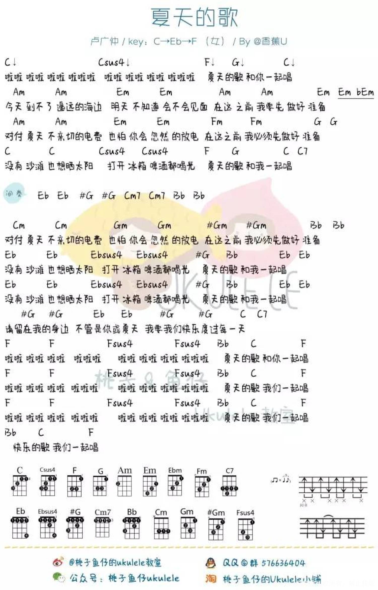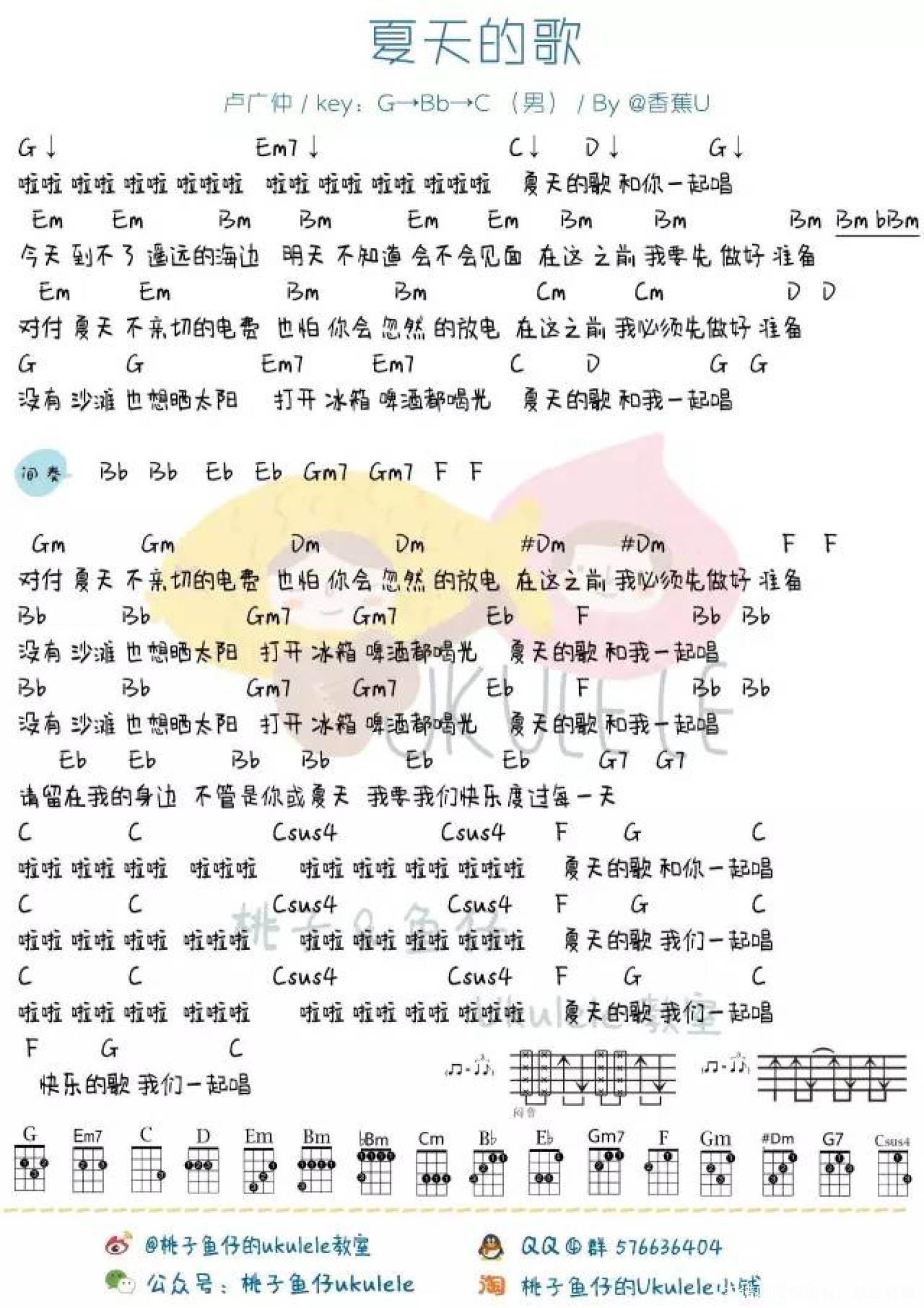 曲谱介绍: 卢广仲《夏 天 的 歌》_C调尤克里里谱_女生版+G调男生版