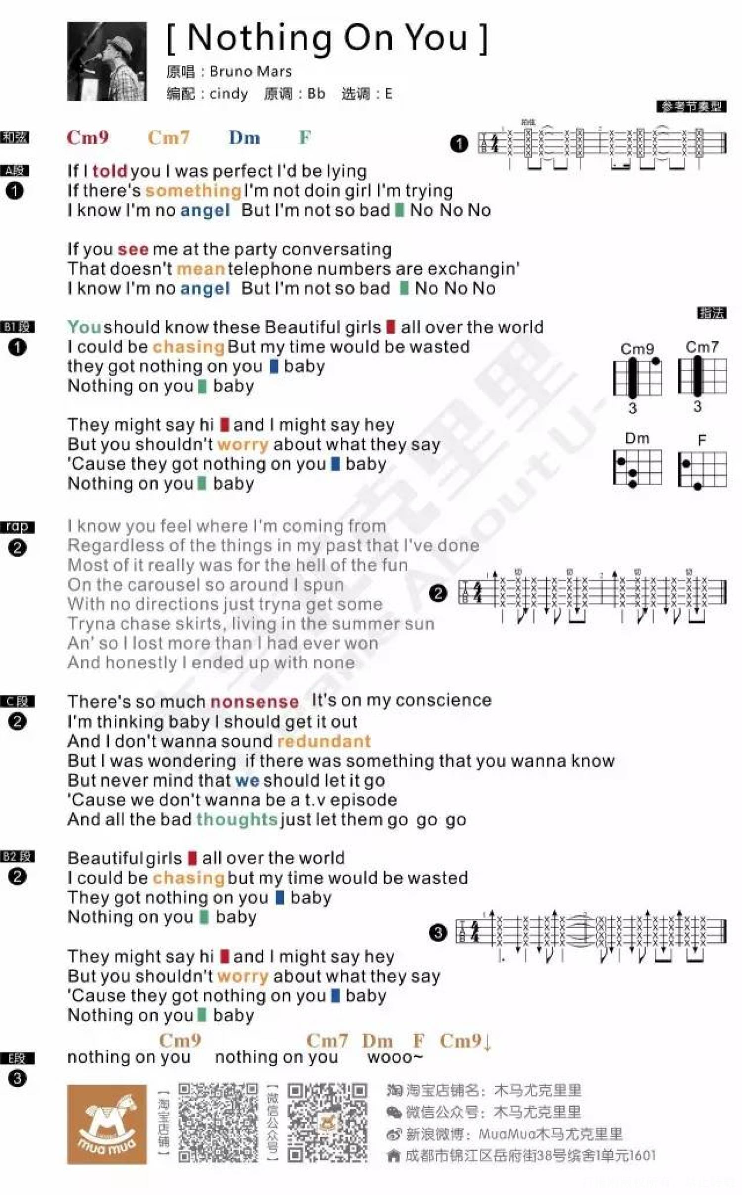 曲谱介绍: 《Nothin'onYou》本来是B.o.B与火星哥BrunoMars合唱的歌曲,但自从小编听到BrunoMars的sololive版以后就无法自拔惹~~~SOLOLIVE版视频