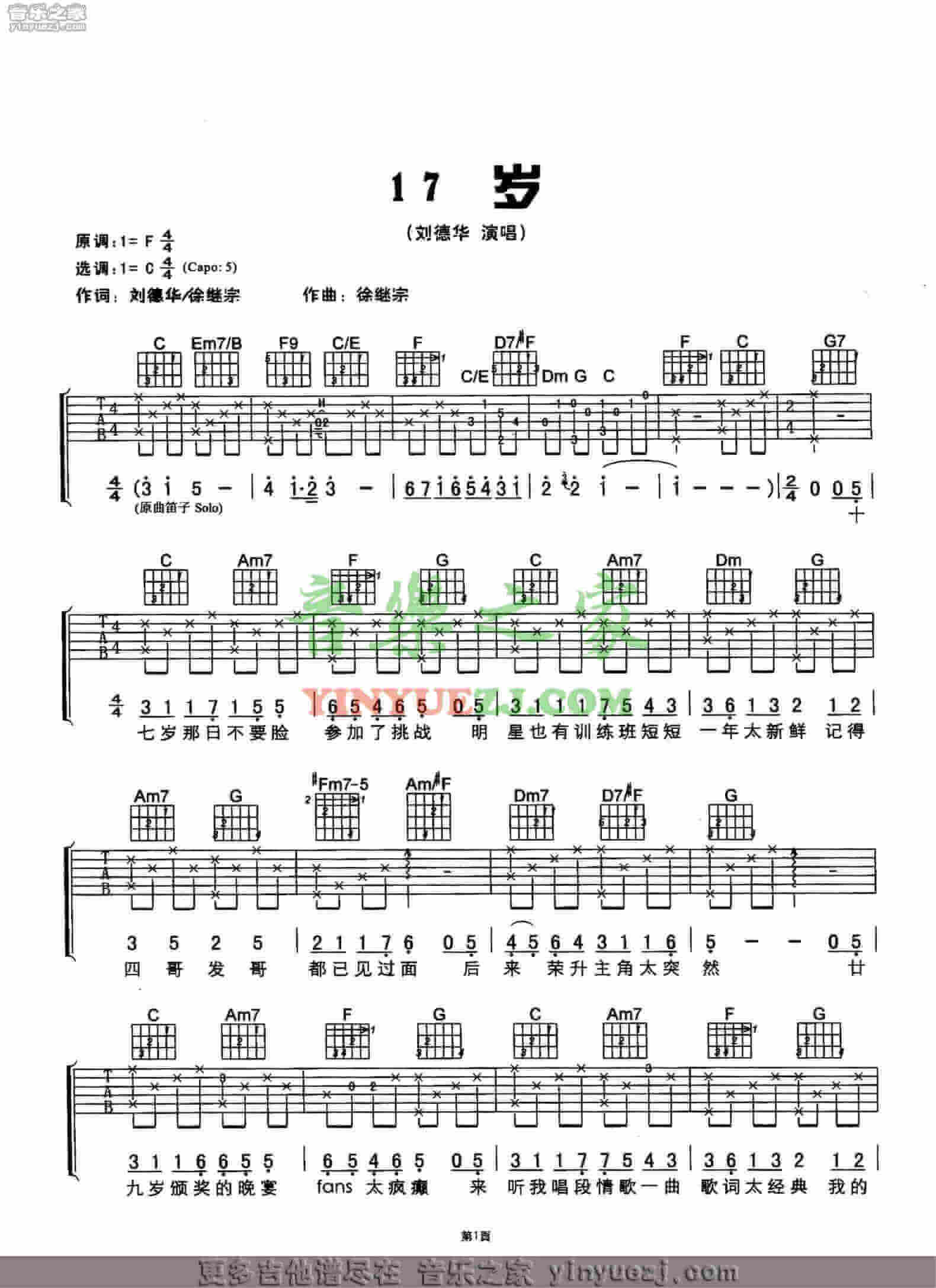 曲谱介绍: 十七岁吉他谱采用了C调指法,由音乐之家编配完成。重要提示:恶作剧吉他谱更新啦,学完这首后,顺便把下首学了吧。