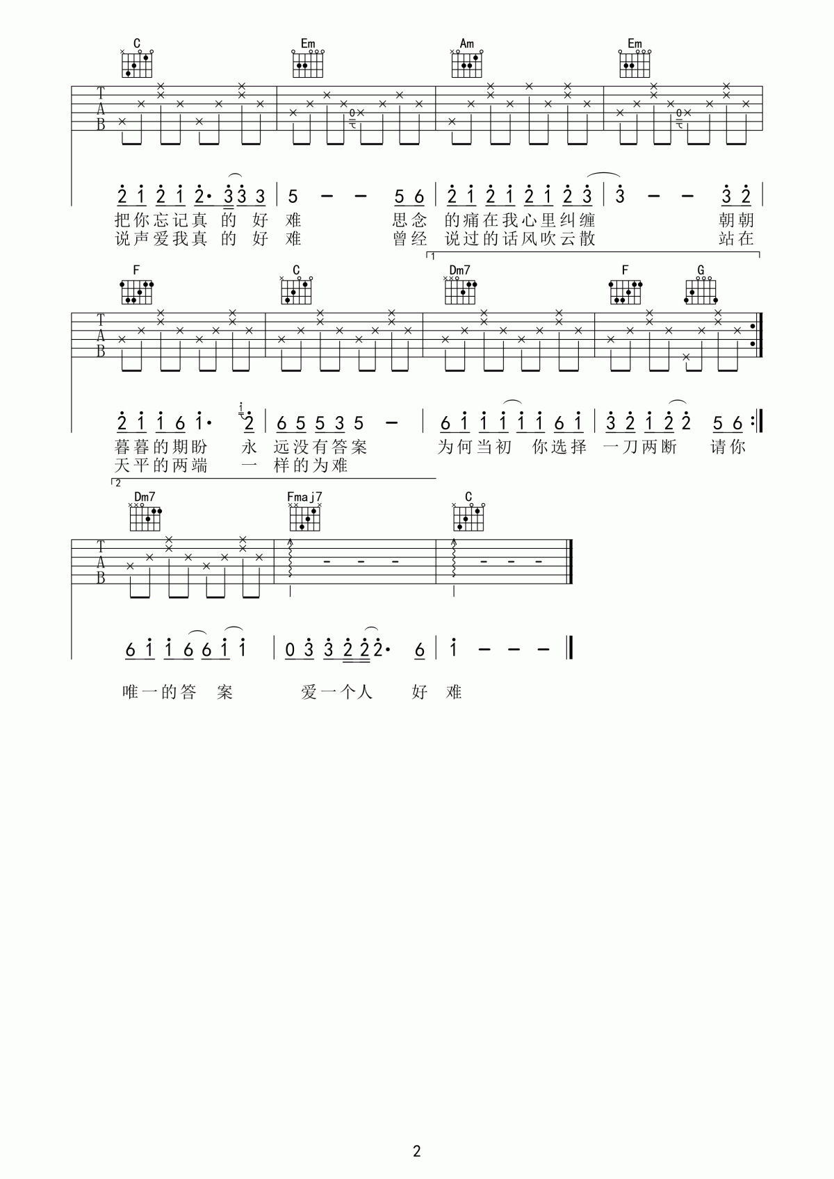 曲谱介绍: 苏永康《苏永康爱一个人好难》吉他弹唱谱,采用C调指法编配,共有2张高清图谱,免翻页排版设计。
