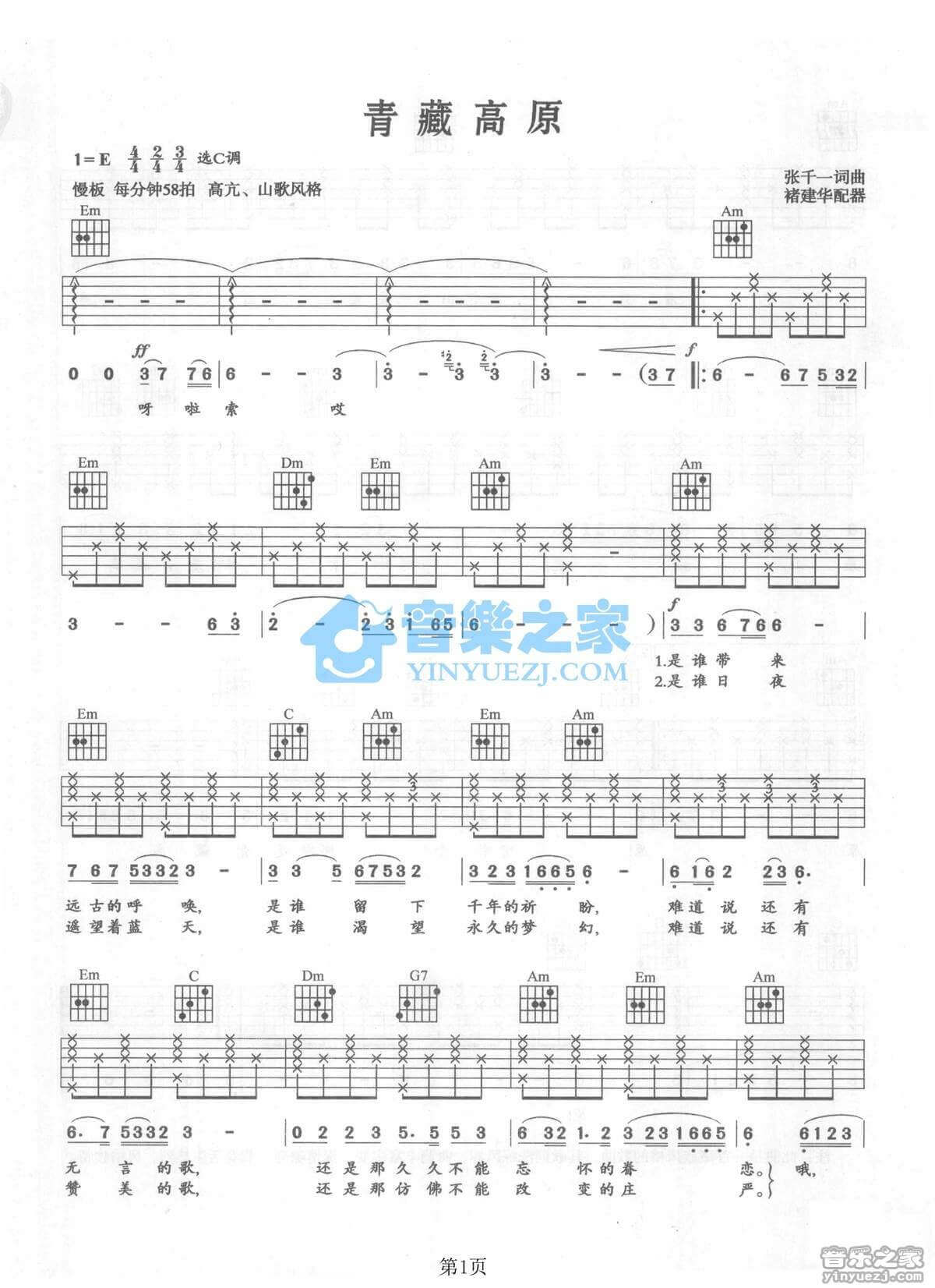 琴谱网为您精心推荐 青藏高原 高清图谱