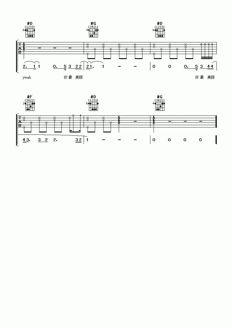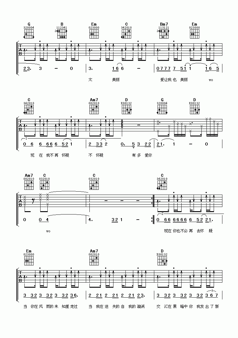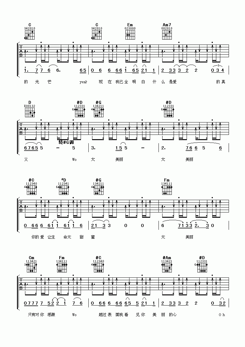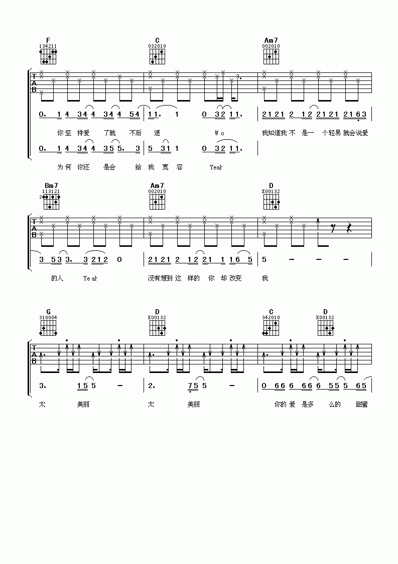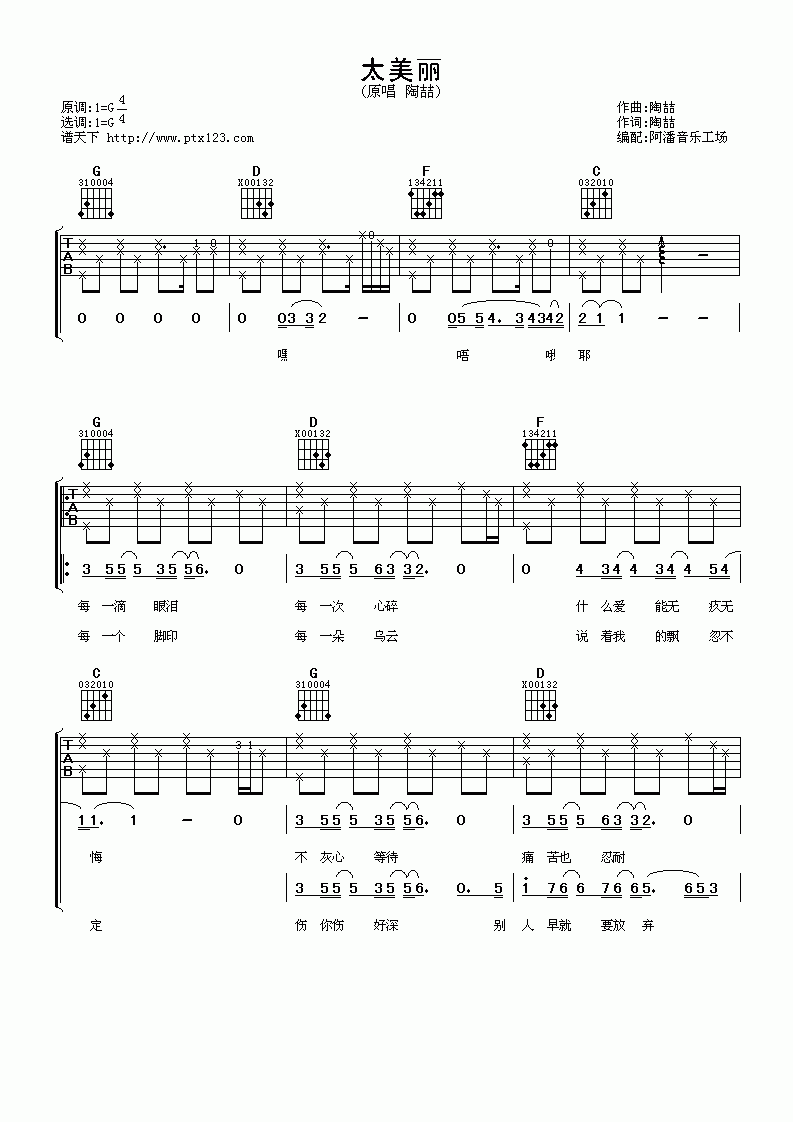 曲谱介绍: 陶喆《陶喆太美丽》吉他弹唱谱,共有5张高清图谱。