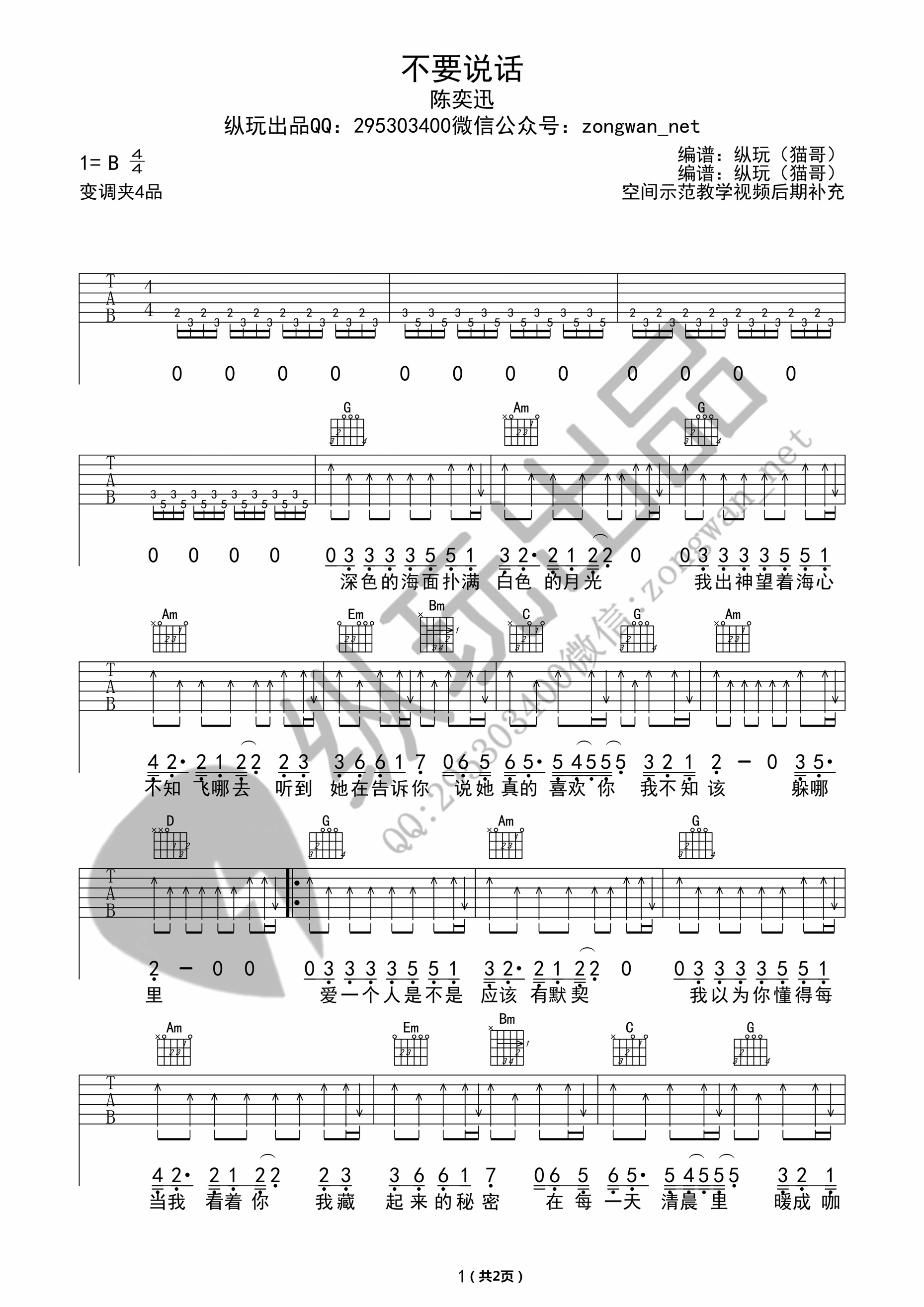 曲谱介绍: 不要说话吉他谱采用了B调指法,由纵玩出品编配完成。歌曲《不要说话》讲述的是一个动人的故事,男生暗恋一位女生,但是没有表白,而且男孩平时是一位不太会说甜言蜜语的人,他的爱是默默无闻的,无私的。号外:在这里小编要推荐这首甘心吉他谱,它也很好听,大家赶快学习起来啦,不要犹豫!