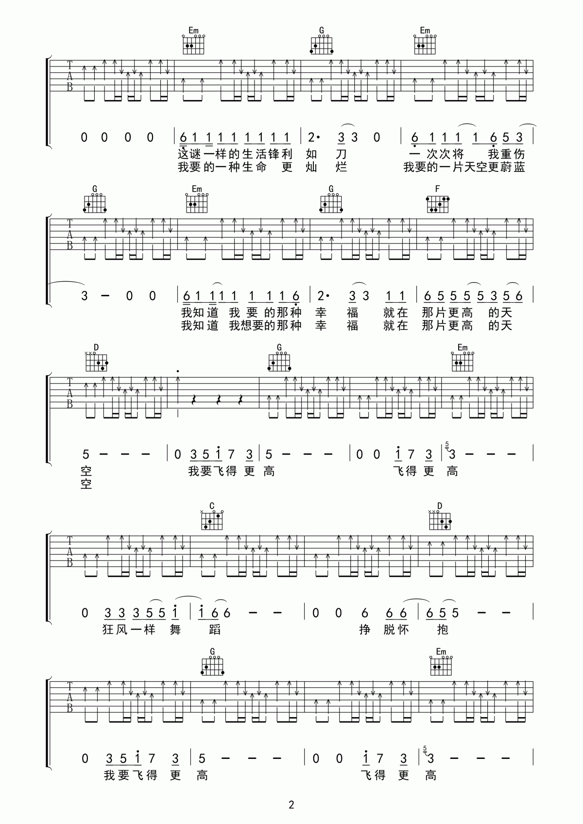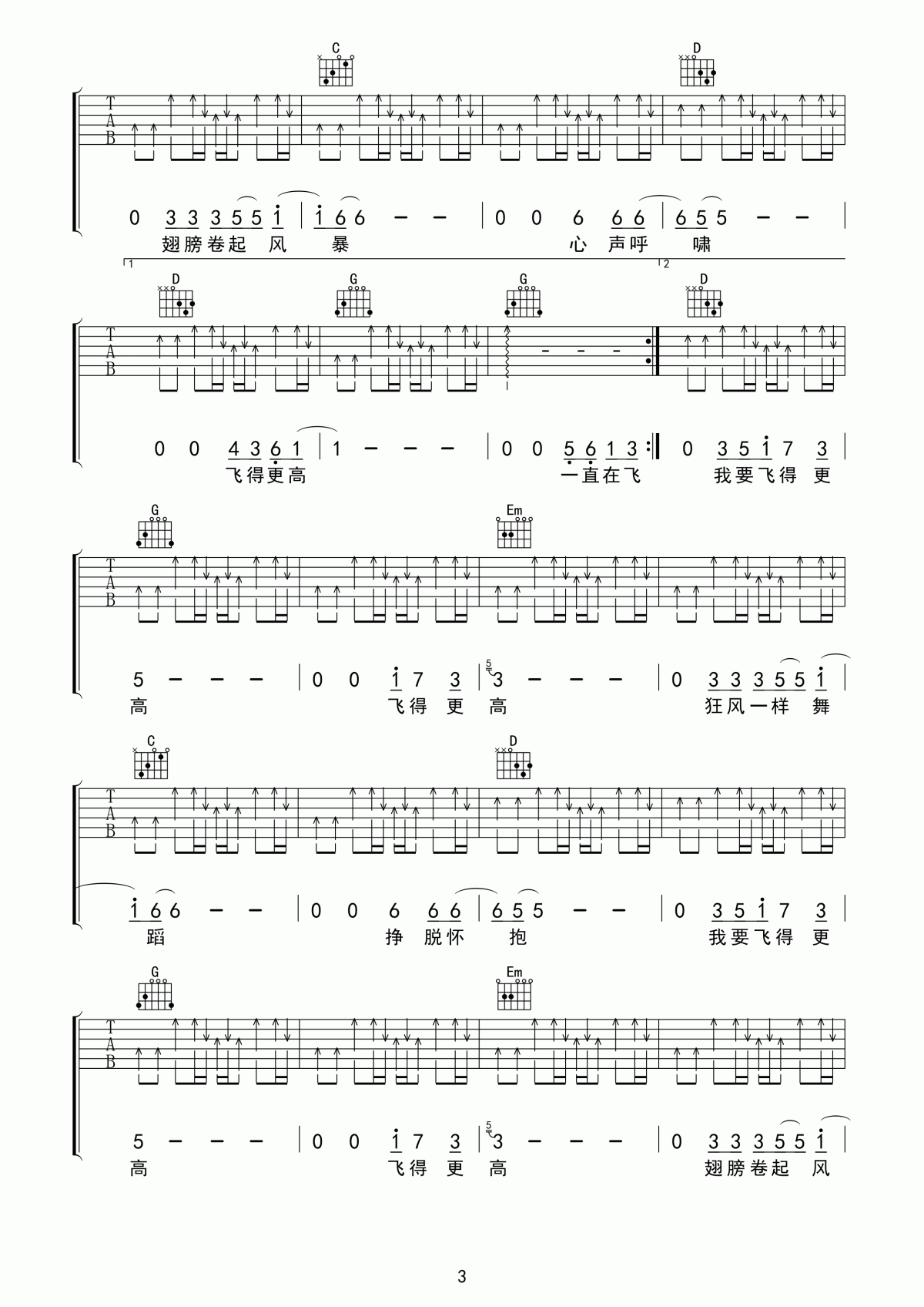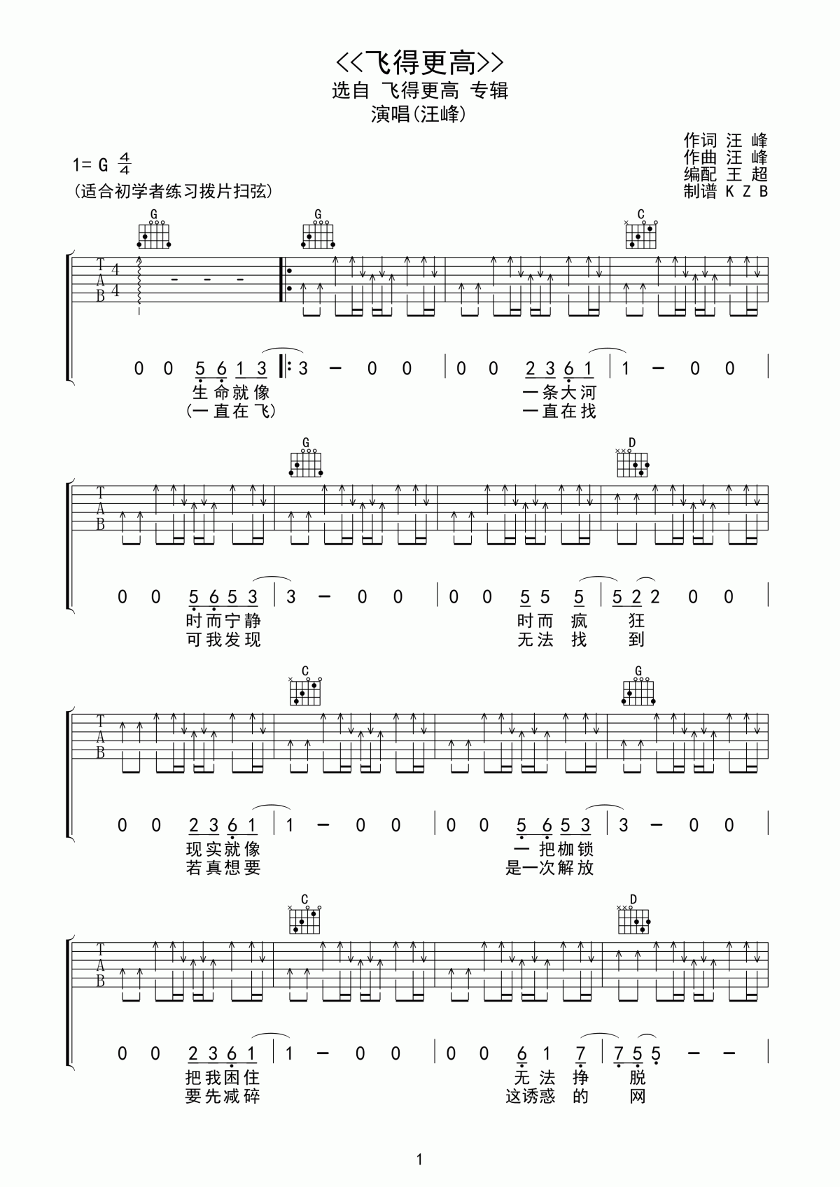 曲谱介绍: 汪峰《飞得更高》吉他弹唱谱,共有4张高清图谱。