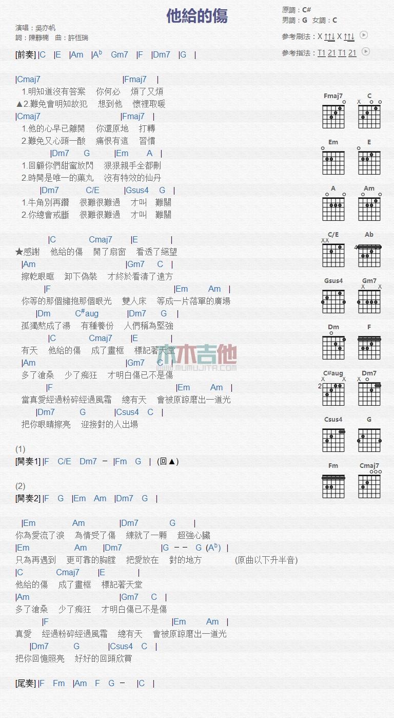 当前位置:琴谱网>吉他弹唱>他给的伤_