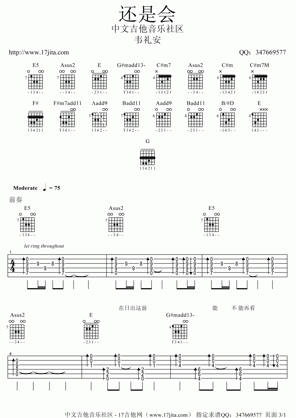 曲谱介绍: 韦礼安《韦礼安还是会》吉他弹唱谱,共有3张高清图谱。