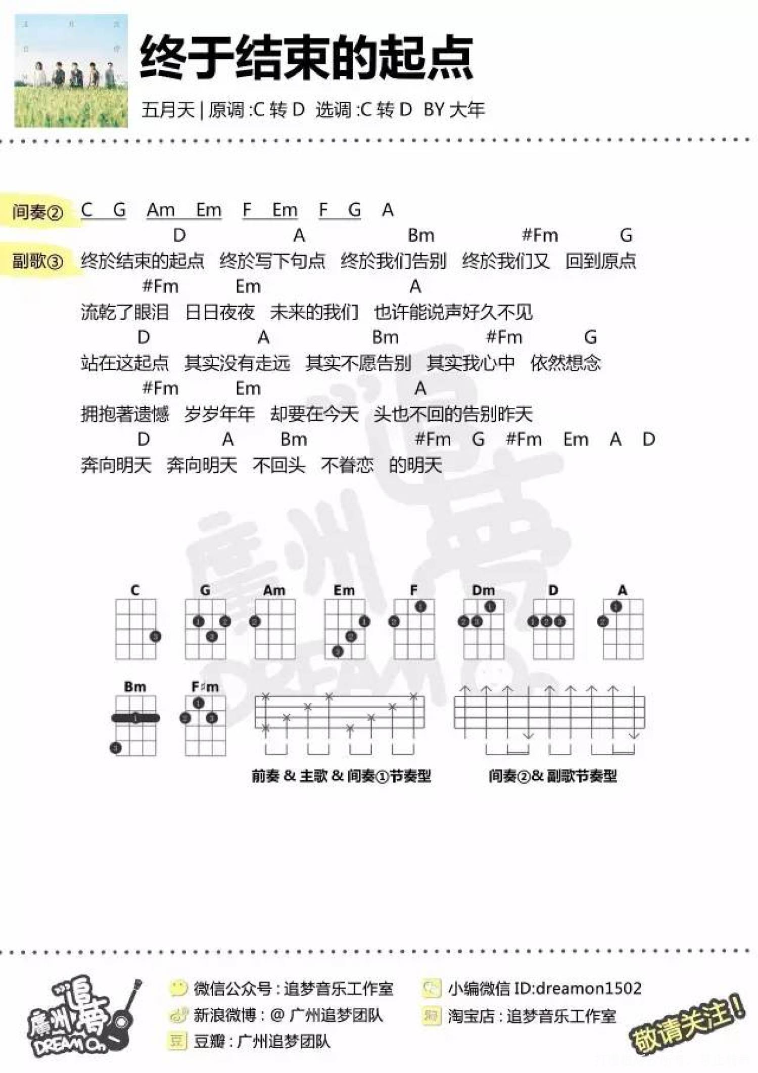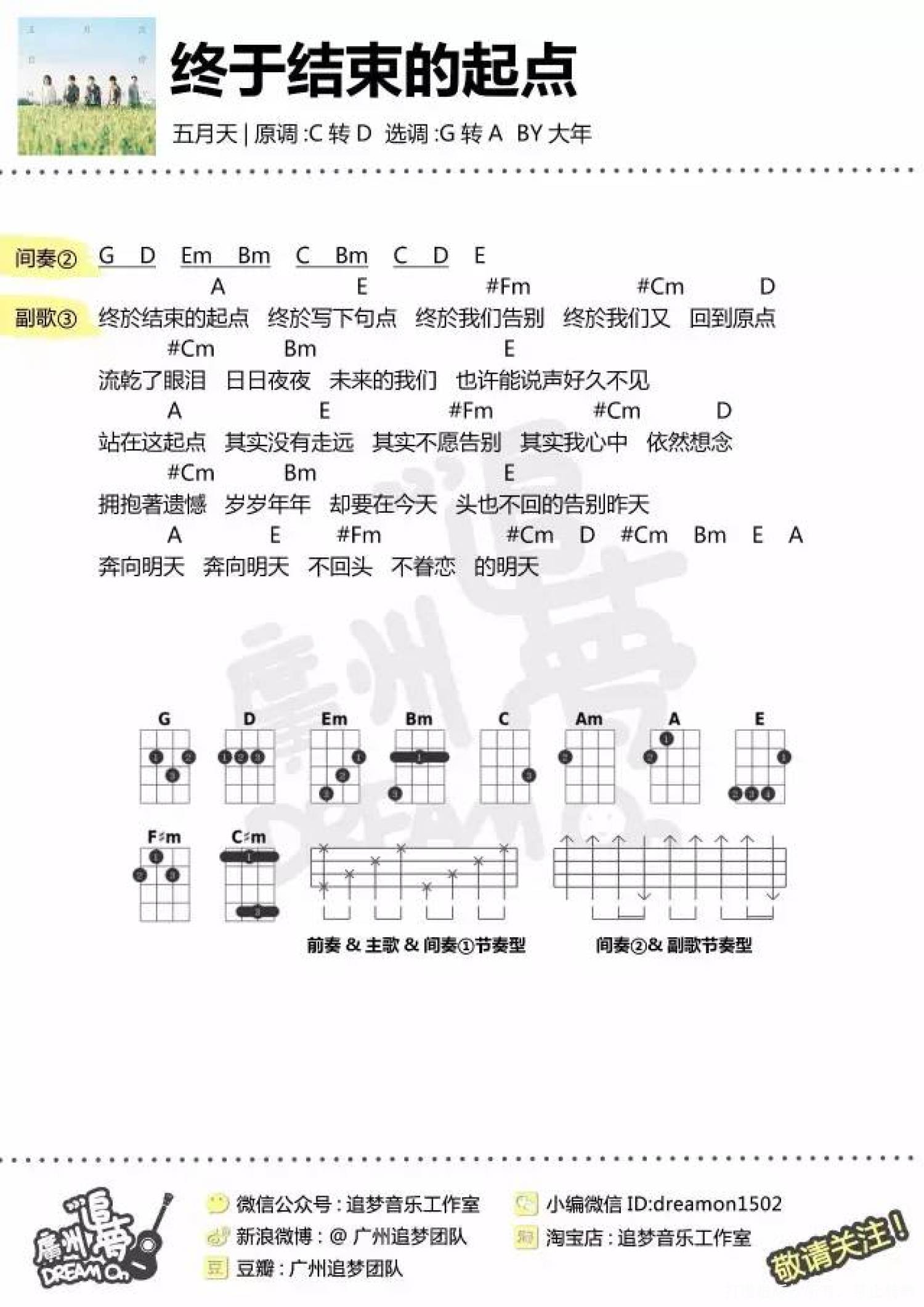 曲谱介绍:   未来的我们,也许能说声好久不见,好久不见。—《终于结束的起点》 《终于结束的起点》是由阿信作词、作曲,五月天演唱的歌曲,收录在五月天第9张音乐专辑《自传》中。 单曲介绍现在的终点,是未来的起点。还原亲密紧贴的距离,undo早已形成的习惯;爱情并不伤人,真正伤人的是没有对错的无奈。即使回到原点,也不再是最初的你我;现在咬牙说出的「再见」,是替未来的「好久不见」预留一个躲雨的屋檐。 《终于结束的起点》  《第二人生》里阿信说,“第一站叫天真,第二站叫青春,下一站的名字等你去确认”。到了《终于结束的起点》,下一站的名字确定了,下一站的名字叫终于。 这也许是五月天爱情五部曲的最终章吧,五部曲回顾走起~ 第一部|萌生爱意—爱情的模样/1999 “你穿过了重重的迷惘,那爱的慌张终于要解放”“你是谁,教我狂恋,教我勇敢地挑战全世界”“我看到远方,爱情的模样” 第二部|热恋—让我照顾你/2004 “是你,爱你让我变得更强,为你战斗永不投降”“让我照顾你,把你未来放在我肩上” 第三部|失恋的惶恐和逃避—突然好想你/2008 “突然好想你,你会在哪里,过得快乐或委屈”“为什么你带我走过最难忘的旅行,却只留下最痛的纪念品”“最怕此生已经决定自己过,没有你,却又突然听到你的消息” 第四部|放不下的惦念—我不愿让你一个人/2011  “你说呢,明知你不在还是会问”“也许未来你会找到,懂你疼你更好的人,下段旅程你一定要更幸福丰盛”“我不愿让你一个人,一个人在人海浮沉” 第五部|告别过去不再眷恋—终于结束的起点/2016 “我们到了站,这一站叫终于”“未来的我们,也许能说声好久不见”“却要在今天,头也不回的告别昨天,奔向明天,奔向明天,不回头,不眷恋的明天” Ukulele曲谱女生版 男生版