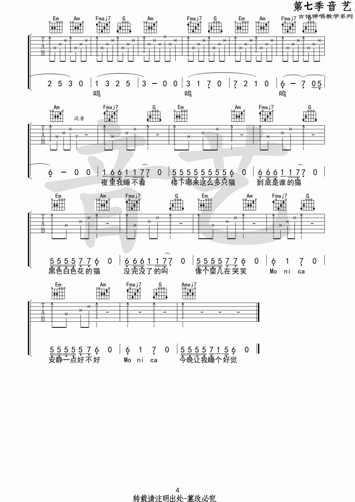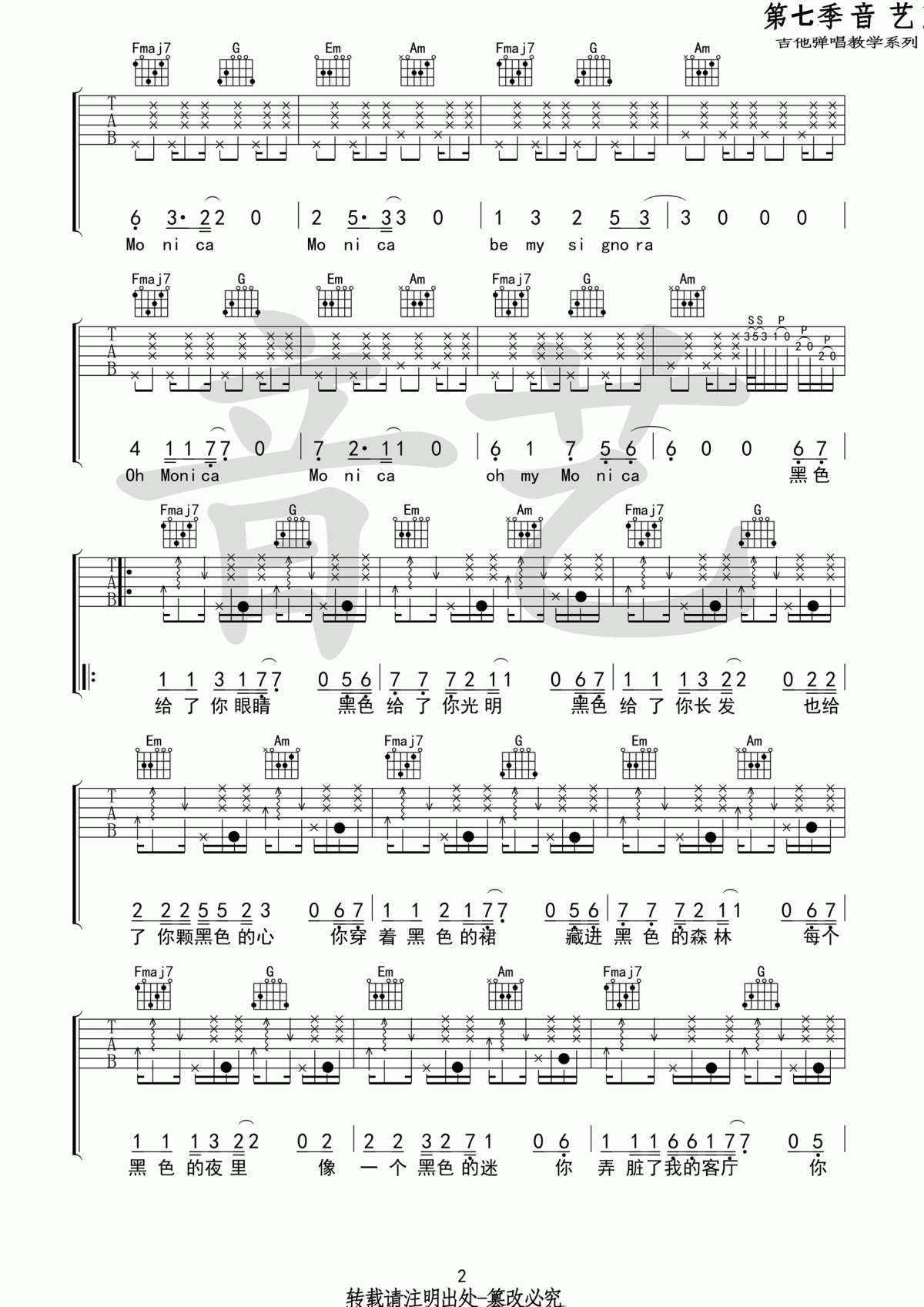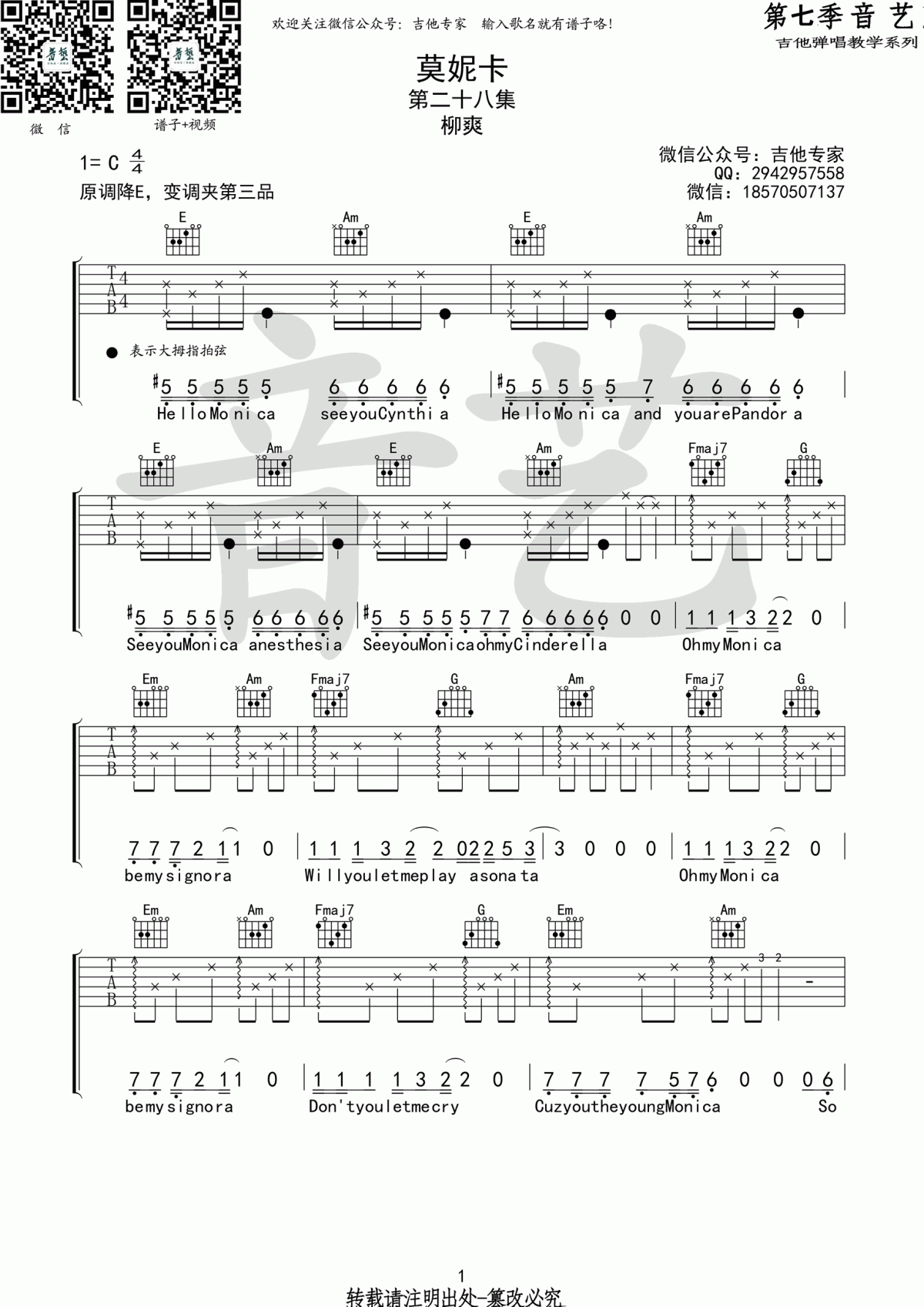 曲谱介绍: 柳爽《莫妮卡》吉他弹唱谱,采用C调指法编配,共有4张高清图谱。