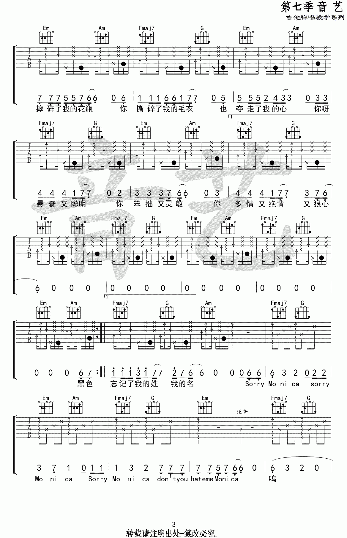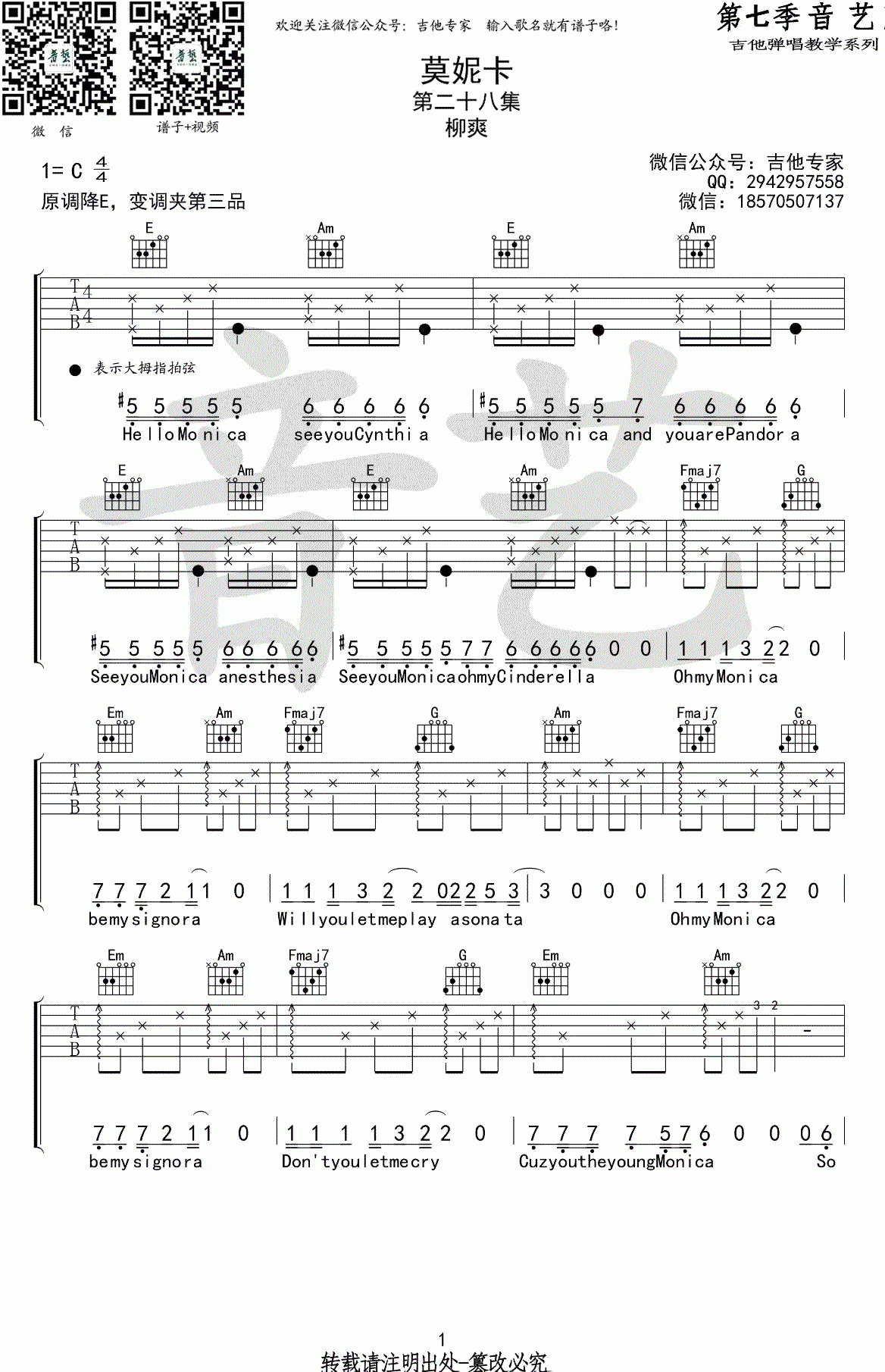 曲谱介绍: 柳爽《莫妮卡》吉他弹唱谱,采用C调指法编配,共有4张高清图谱。