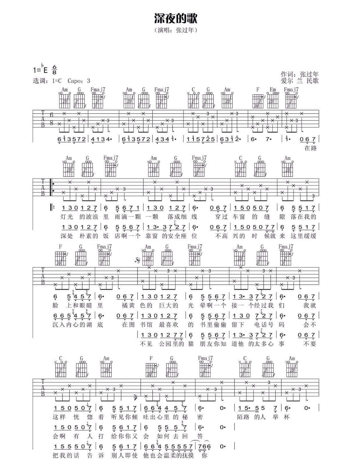 深夜的歌吉他谱 - 张过年 - C调吉他弹唱谱