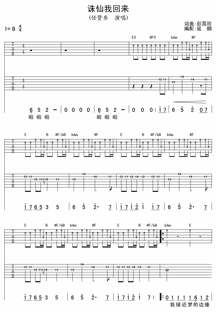 曲谱介绍: 诛仙我回来吉他谱采用了B调指法,由延麟编配完成。以前栏目每周期播报最热曲目,任贤齐的歌几乎贯穿整个大陆的无数的少年时期,他的歌曲让我们想起了曾经那些美好的青春回忆。这首关键词吉他谱也很帅,快点去学习吧,没学会的小伙伴要继续加油喔,稳!