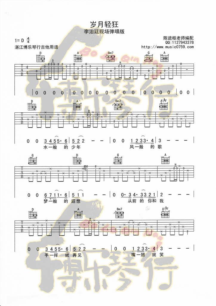 曲谱介绍: 李治廷《岁月轻狂》吉他弹唱谱,采用D调指法编配,共有3张高清图谱。