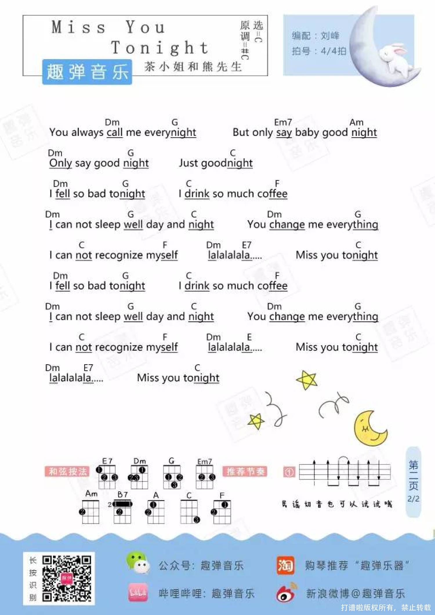曲谱介绍: 茶小姐和熊先生《Miss You Tonight》_C调尤克里里谱