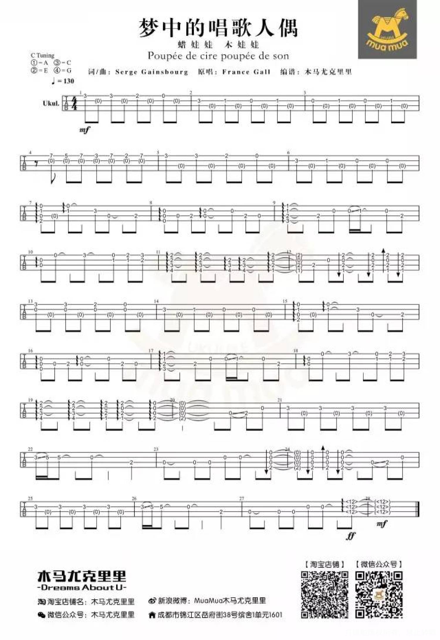 FranceGallPoupeeDeCire,PoupeeDeSon木娃娃,蜡娃娃(梦中的唱歌人偶) 废话少说,先听首歌 如果你喜欢法语老歌那你一定听过FranceGall(法兰西·高)的名字她是叱刹法语歌坛几十年之久她的名字和众多法国流行音乐艺人一起成为了当代法语歌坛的一个神话FranceGall原名IsabelleGall1947年10月9日出生于巴黎,1963年16岁时凭借单曲《Nesoispassibête》开始广为人所知1965年参加卢森堡欧洲歌唱大赛凭借《Poupéedecire,poupéedeson》夺得冠军也就是上面黑白画面传出的美妙香颂小心前方萝莉出没 之后,19岁的FranceGall凭SergeGainsbourg作词作曲的LesSucettes一夜之间红透法国,歌曲唱的是一个痴迷棒棒糖的小姑娘(这是一首作词非常邪恶的歌曲,有空我们再详细展开)同时“PoupeedeCire,PoupeedeSon”(木娃娃蜡娃娃)摘得当年EurovisionSongContest的桂冠,这次获奖不仅使其歌唱事业达到了第一次高峰,并且奠定了她日后成为流行天后的基础。 虽然当时Gall的风格曾被法语歌曲评论员LesleyGore称之为软绵、做作毫无内涵的暧昧声音(确实Gall当时的风格极端单一),但是Gall的声音确实在当时那个年代广受欢迎,其人气甚至无人能及。后来曲风得以改变,Gall的音乐路途越加宽阔起来。也是她曲风上的变化,使之不局限与法国本地发展,而是着眼与整个欧洲歌坛、甚至还在日本发片,“PoupeedeCire,PoupeedeSon”更以“夢見るシャンソン人形”(梦中的唱歌人偶)发行了“木娃娃蜡娃娃”的日文版,引来后世无数日本艺人翻唱的热潮,日文曲名翻译的曲名也是我非常喜欢的。夢見るシャンソン人形 《梦中的唱歌人偶》日文版歌词我的是梦中的唱歌人偶一直在心里充满着乐曲的人偶我是漂亮的人偶今生看起来像是玫瑰色的夹心糖果啊我所唱的歌是任何人都能听的啊大家也都能看得见我的身影任何人永远都可以一边笑着一边听我唱歌而起舞大家看来都跳的很高兴然而真正的爱情生命的都是只在歌曲当中我所唱的歌是任何人都能听的啊大家也都看得见我的身影我时常叹气道男孩一个也不认识然而唱着情歌的那种寂寥我只是个人偶然而总有一日会尽力地去唱歌跟某处的完美的某个人接吻的啊今天我们带来的这首曲谱希望能把大家带回那个香颂飘荡的年代PS作为萝莉控的土匪由于法语稀烂就编了个指弹谱希望广大萝莉控谅解不过就算写了法语歌词你们也不会唱 土匪演示视频(常速和慢速) 曲谱曲谱要点要点——1.括号()表示幽灵音,需轻弹作为辅音,切忌和主音力度一样大。2.最后一个音用尖括号表示自然泛音,左手不按弦,食指或中指轻轻搭在123弦的12品的品丝正上方,右手迅速琶音,然后略微延迟的放开左手手指即可发出自然泛音。3.曲谱已经包含了全部的乐曲段落,因为全部是重复的,本谱里就不表现了,各位小伙伴要弹奏完整的版本就不断的重复其中的段落就好啦~~