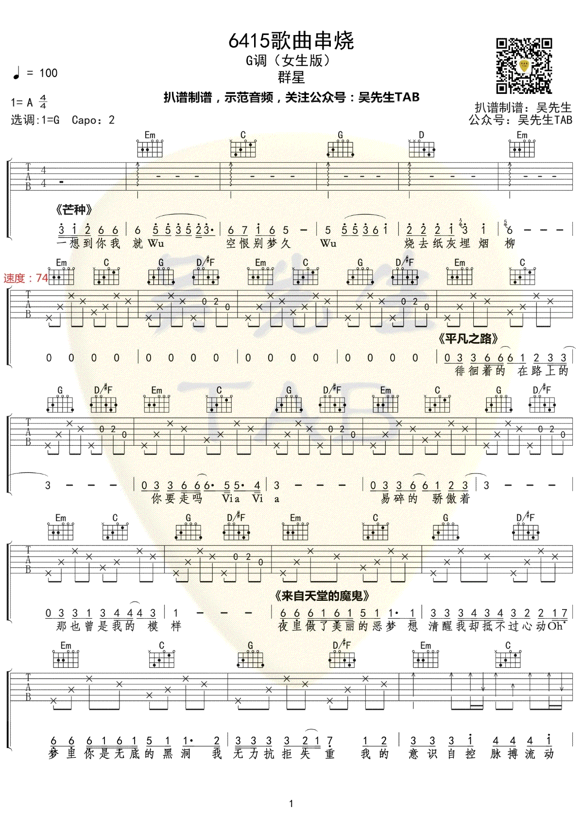 曲谱介绍: 6415歌曲串烧吉他谱采用了A调指法,由吴先生编配完成。这一段歌曲串烧受到了很多人的喜爱,在这一段歌曲串烧里面都是最近很受欢迎的音乐作品,它们搭配在一起,碰撞出了不一样的火花,给听众带来了很多的惊喜,我们能够从一首歌曲里面收获到多份的快乐和感动,能够让我们收获到很多不一样的东西,而且他们的演唱融合了自己的风格,让我们听起来十分舒适,十分享受。听兄弟说,告辞吉他谱听了耳朵会怀孕,快快学起来,学完去撩妹!