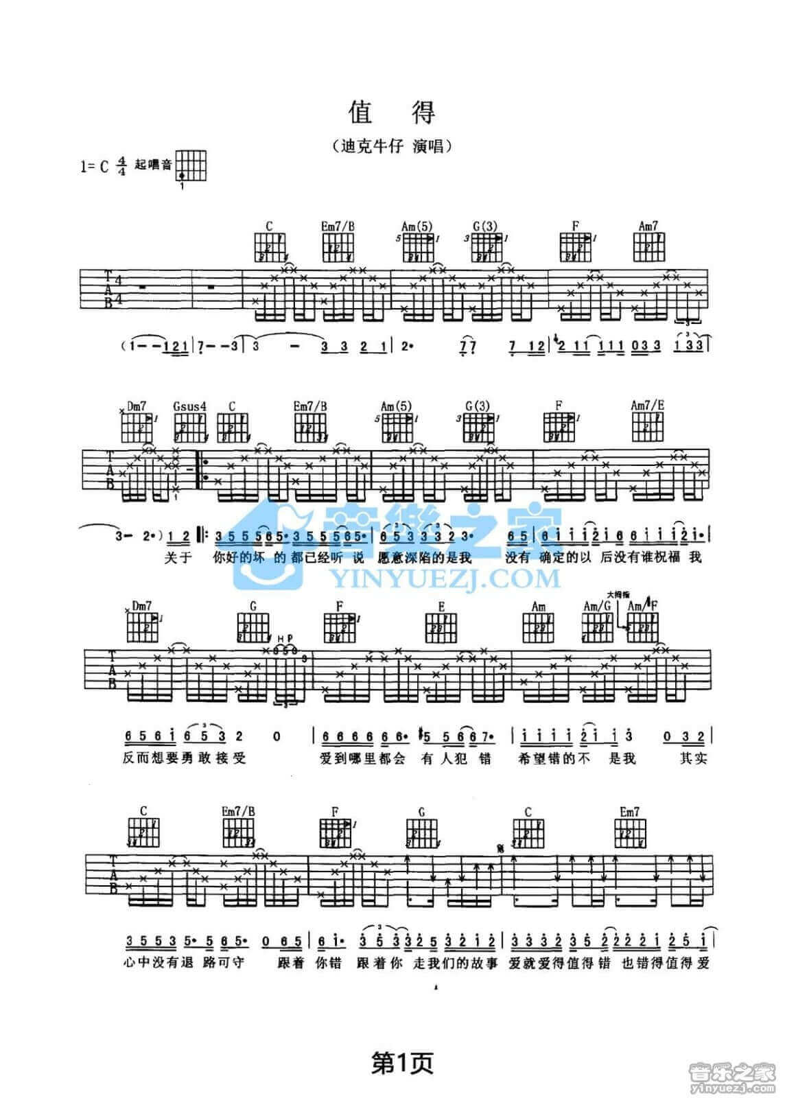 值得吉他谱 - 迪克牛仔 - C调吉他弹唱谱